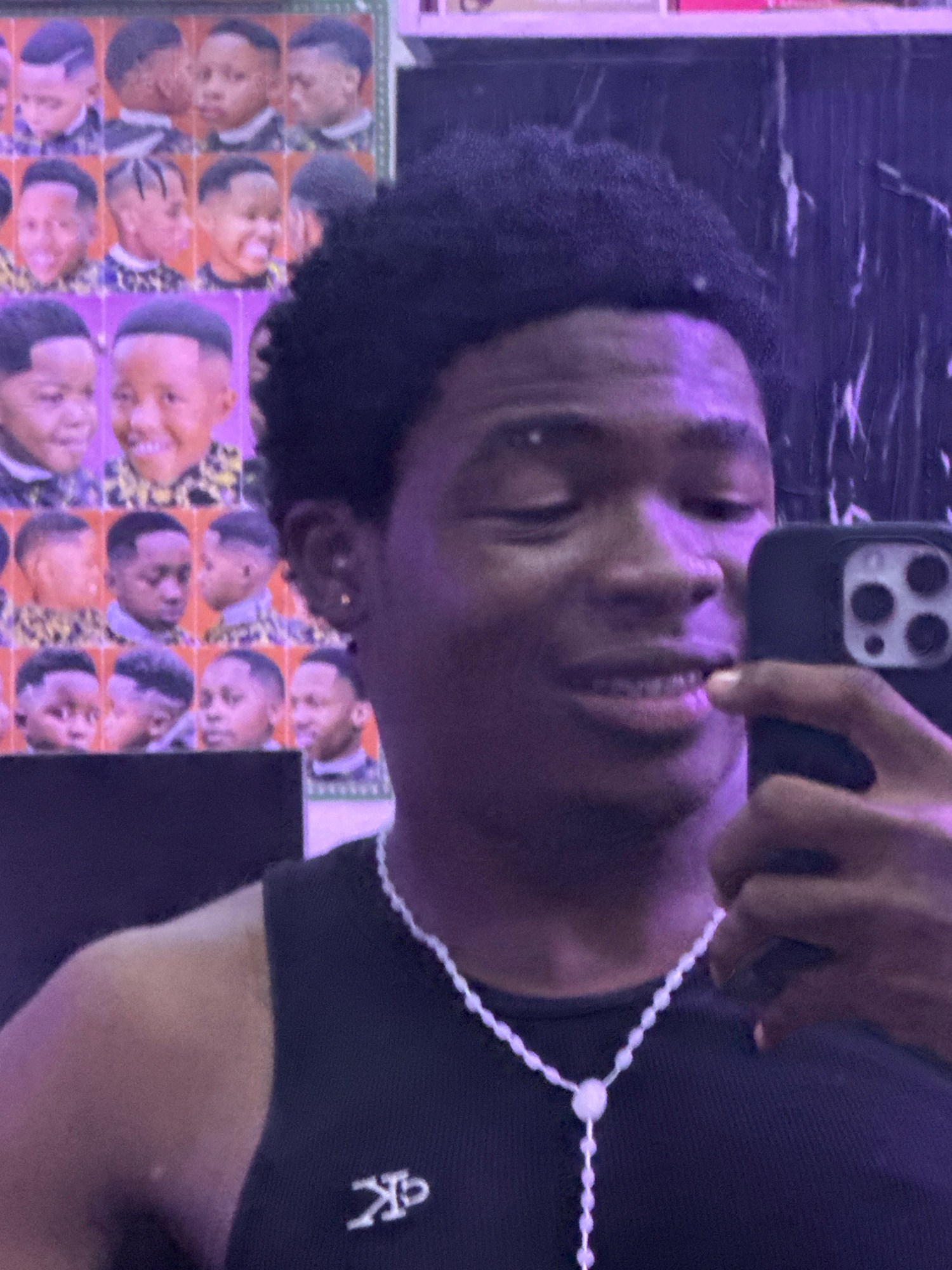 A person with dark skin and short, curly black hair is taking a selfie. They are wearing a black shirt with a white logo on the upper right. A white beaded lanyard hangs around their neck. They are ho…read more