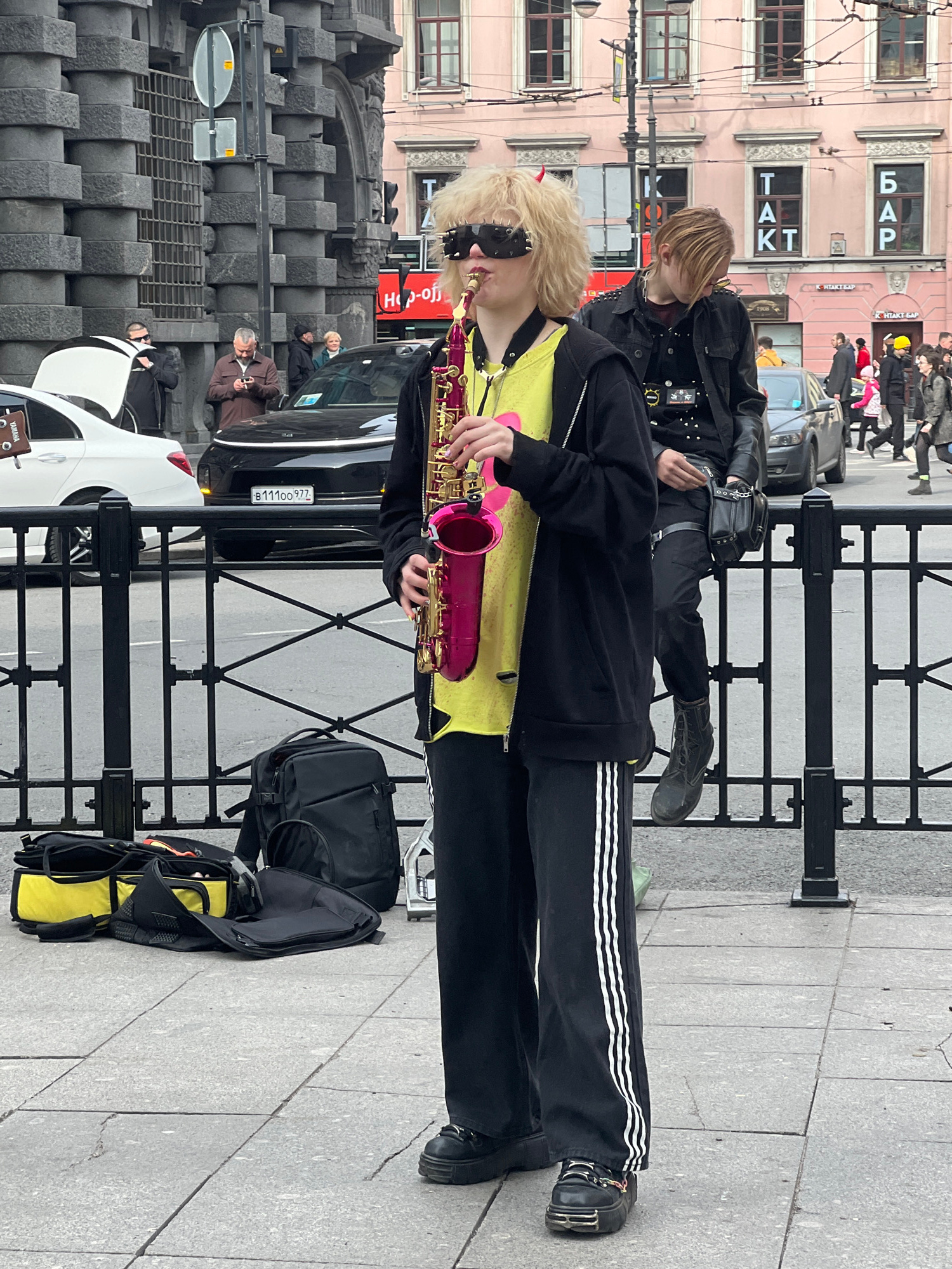 The image captures a street scene in Saint Petersburg, Russia. A performer stands with a pink saxophone near a metal fence alongside a road. The performer is dressed in black clothing with white strip…read more
