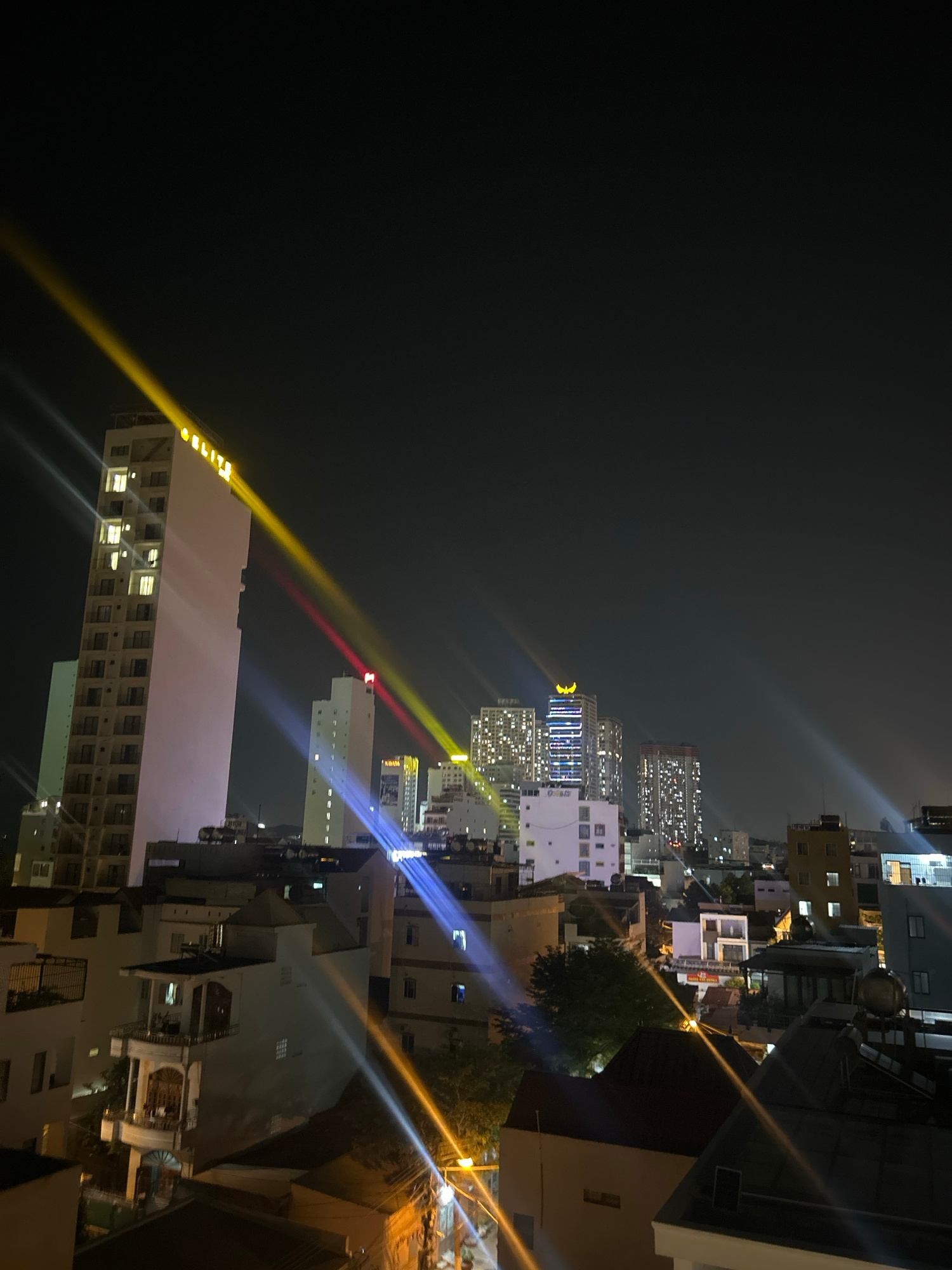 The image shows a night view of Bắc Nha Trang, Vietnam. High-rise buildings dominate the skyline. Lights from windows and streetlights illuminate the scene, creating lens flares. The sky is dark and c…read more