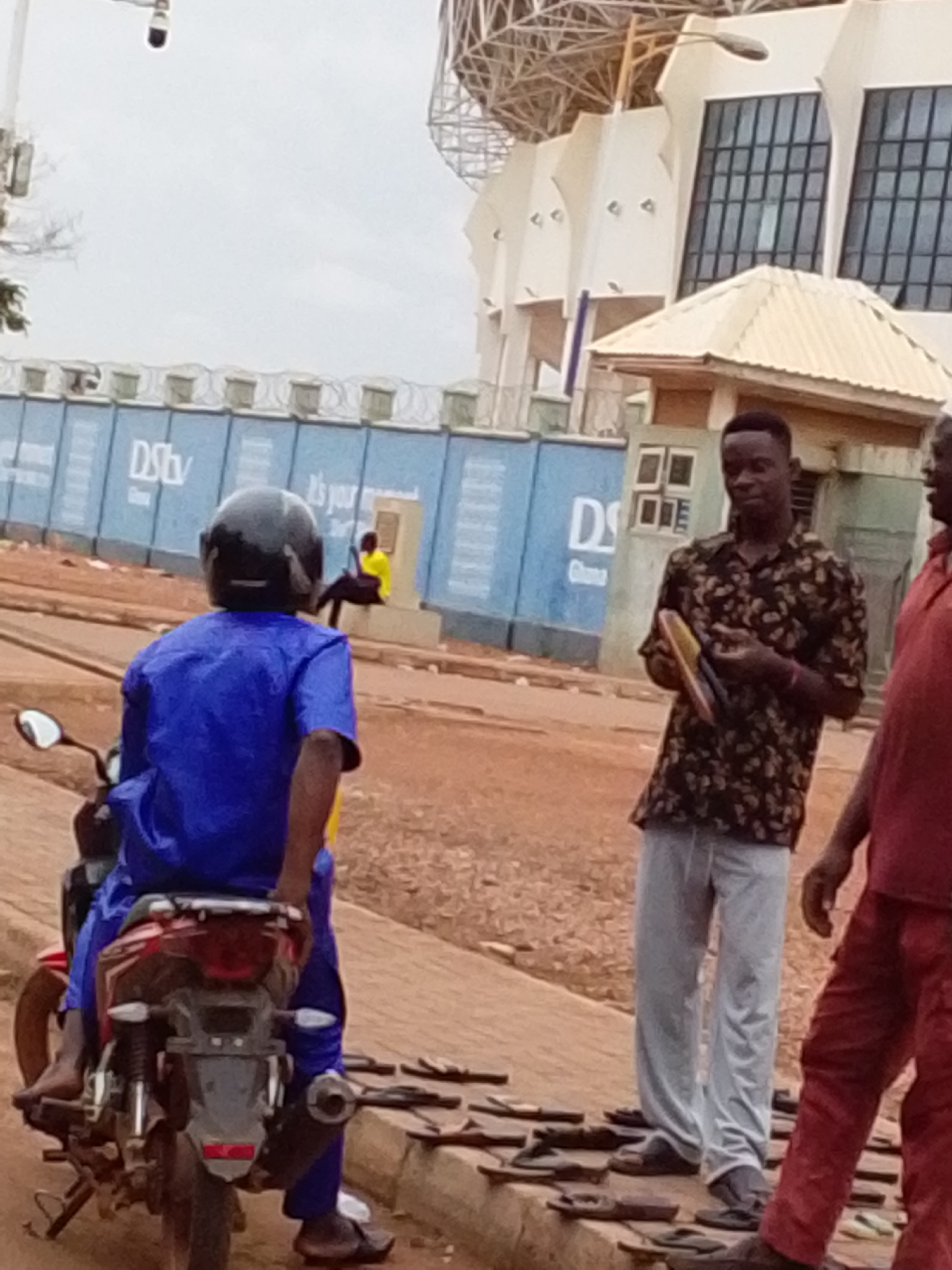 The image shows a street scene in Tamale, Ghana, featuring several individuals and objects against the backdrop of a stadium. A man on a red motorcycle wearing a blue shirt and a black helmet has his…read more