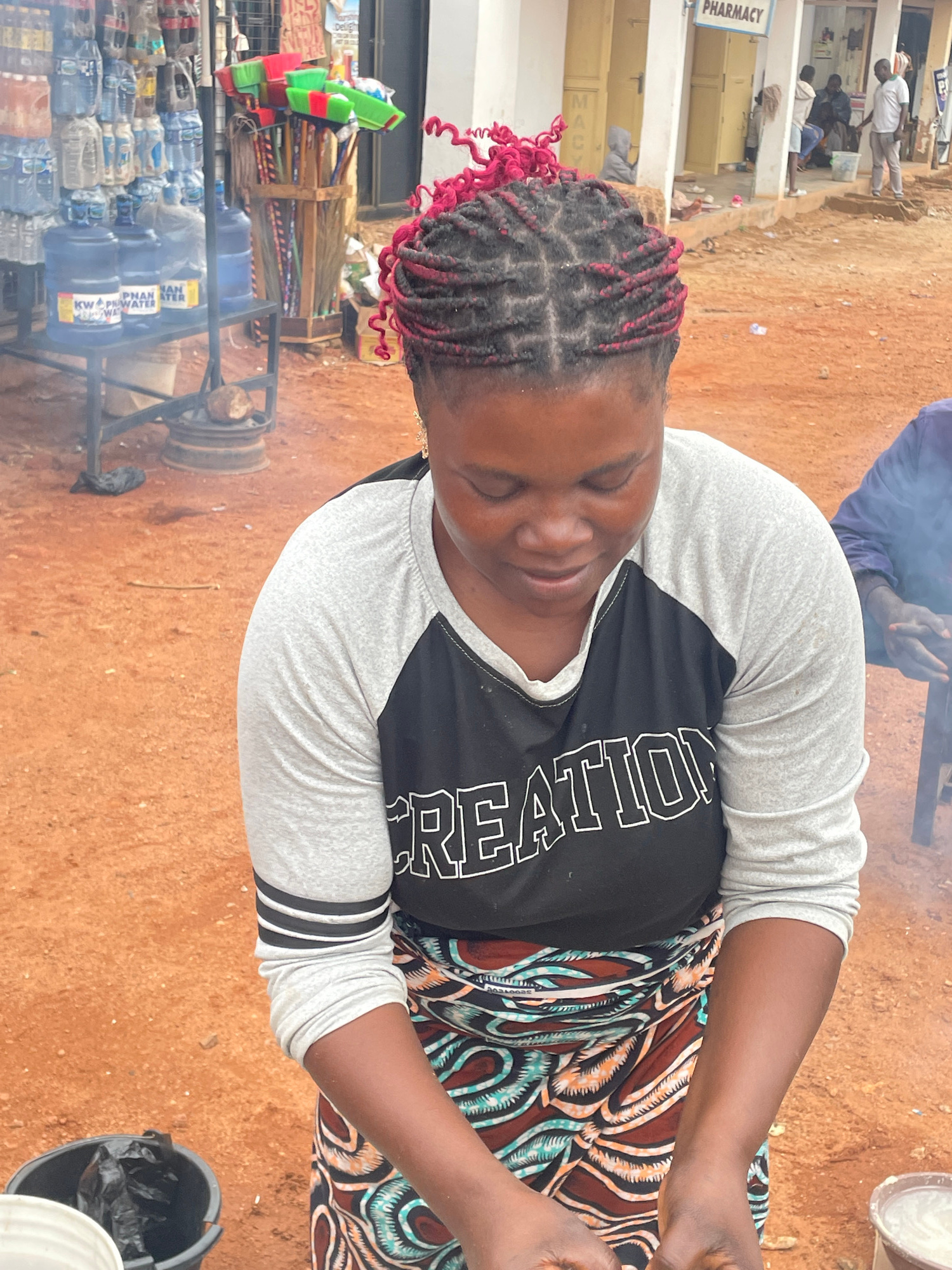 A medium-shot photograph shows a woman sitting outdoors, likely in Jos, Nigeria. The woman has dark skin, braided hair with red accents, and is wearing a grey and black baseball tee with "RECREATION"…read more
