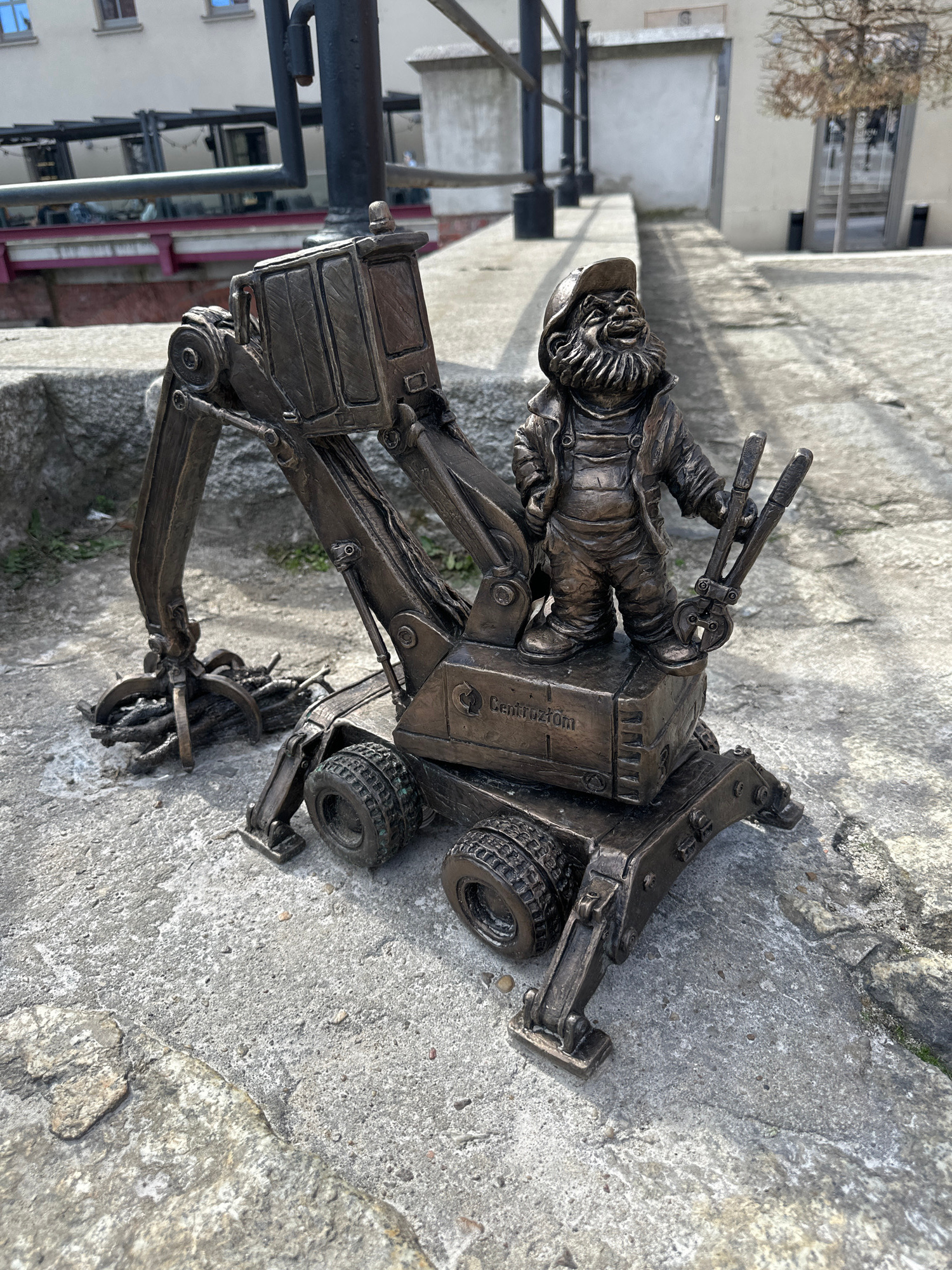 A bronze dwarf statue of a construction worker operating an excavator is positioned on a concrete surface. The dwarf is seated on the vehicle, holding tools. The excavator is detailed, with wheels, ar…read more