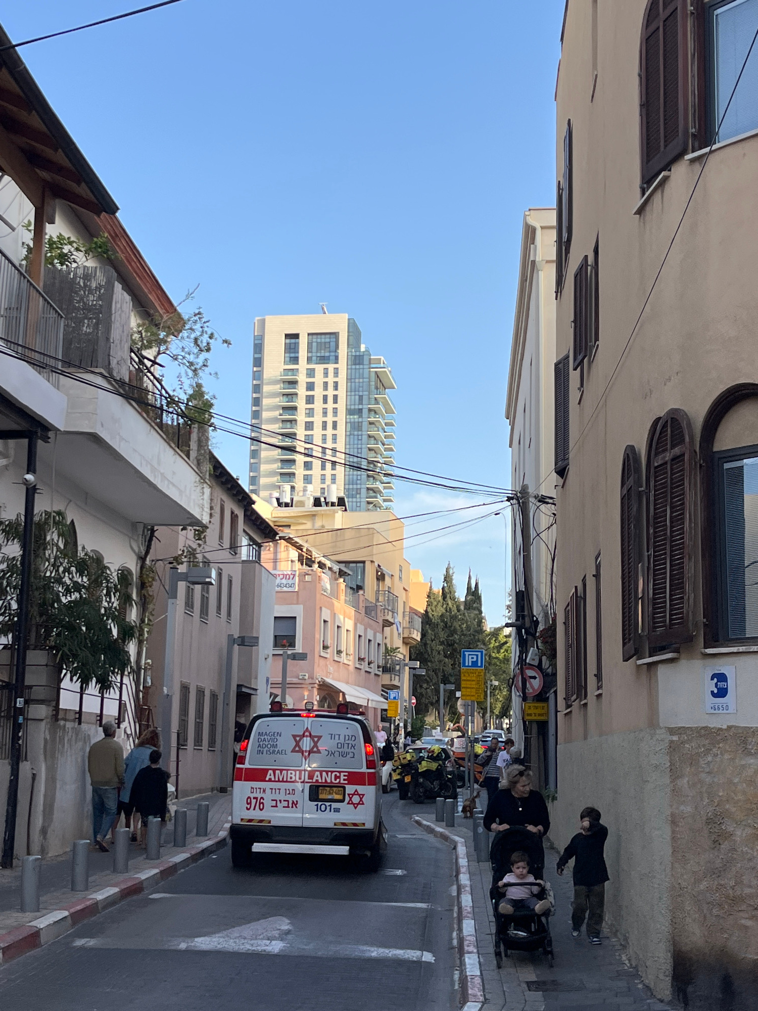An ambulance is parked in a narrow street in Tel Aviv, Israel. People are walking on the sidewalk. In the background, a tall modern building is visible. The ambulance has the Star of David and Hebrew…read more