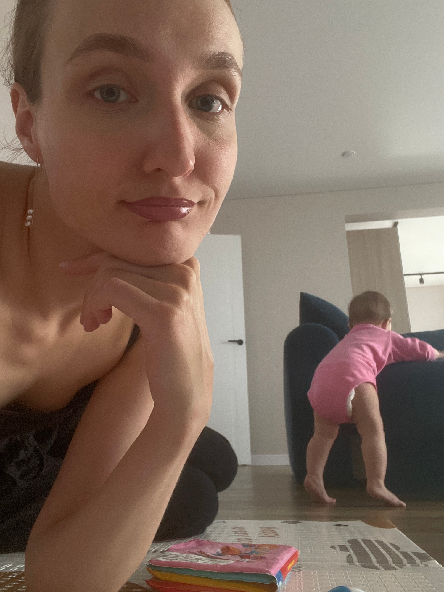 The image is a tilted, low-angle indoor selfie featuring a woman in the foreground and a baby in the background, set in Sepych, Russia. In the foreground, an adult woman with light skin, light-colore…read more