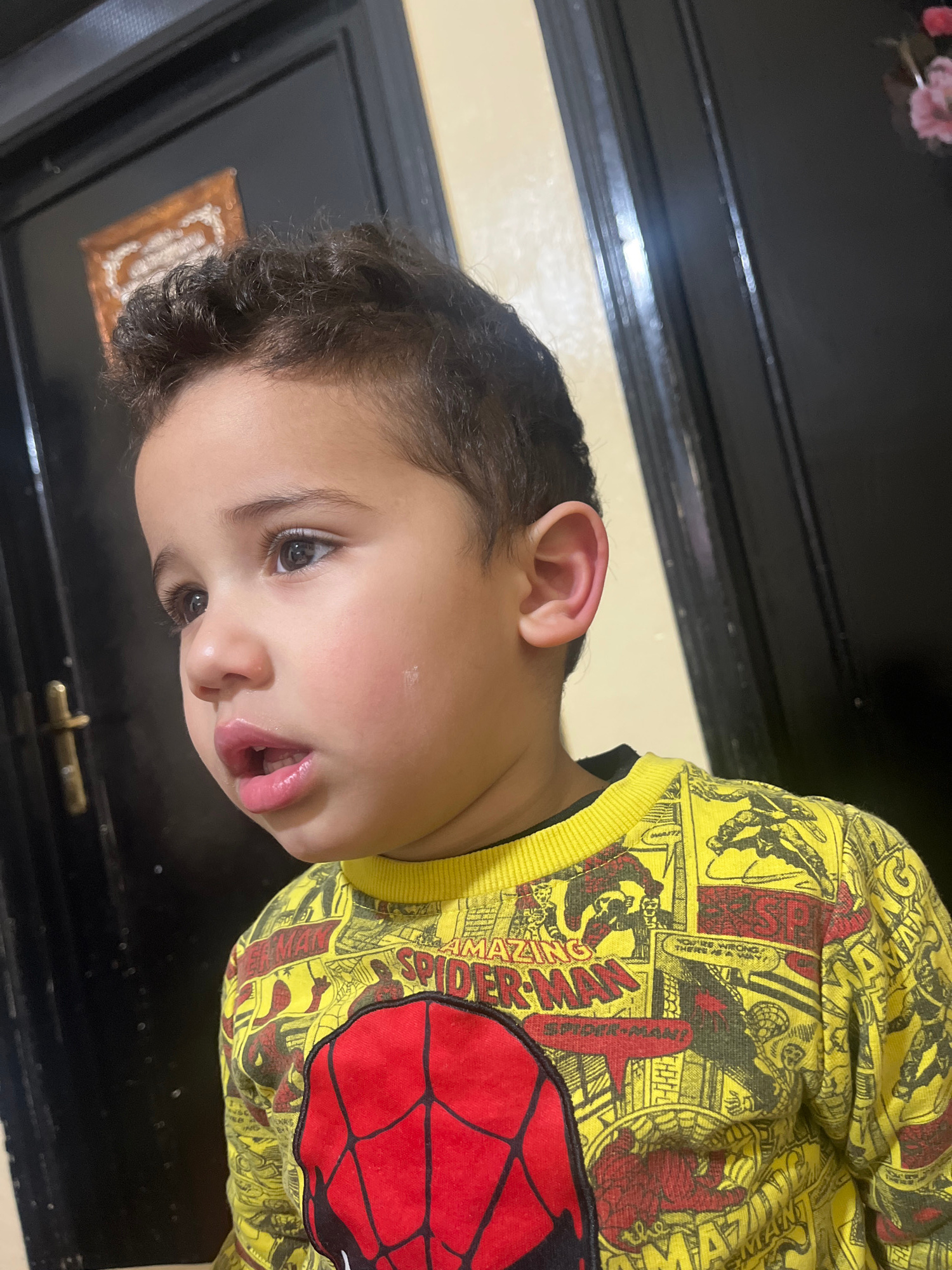 A young child with curly brown hair and light skin is wearing a yellow Spiderman-themed shirt. The background includes a black surface, possibly a piece of furniture, and a light beige wall. The child…read more