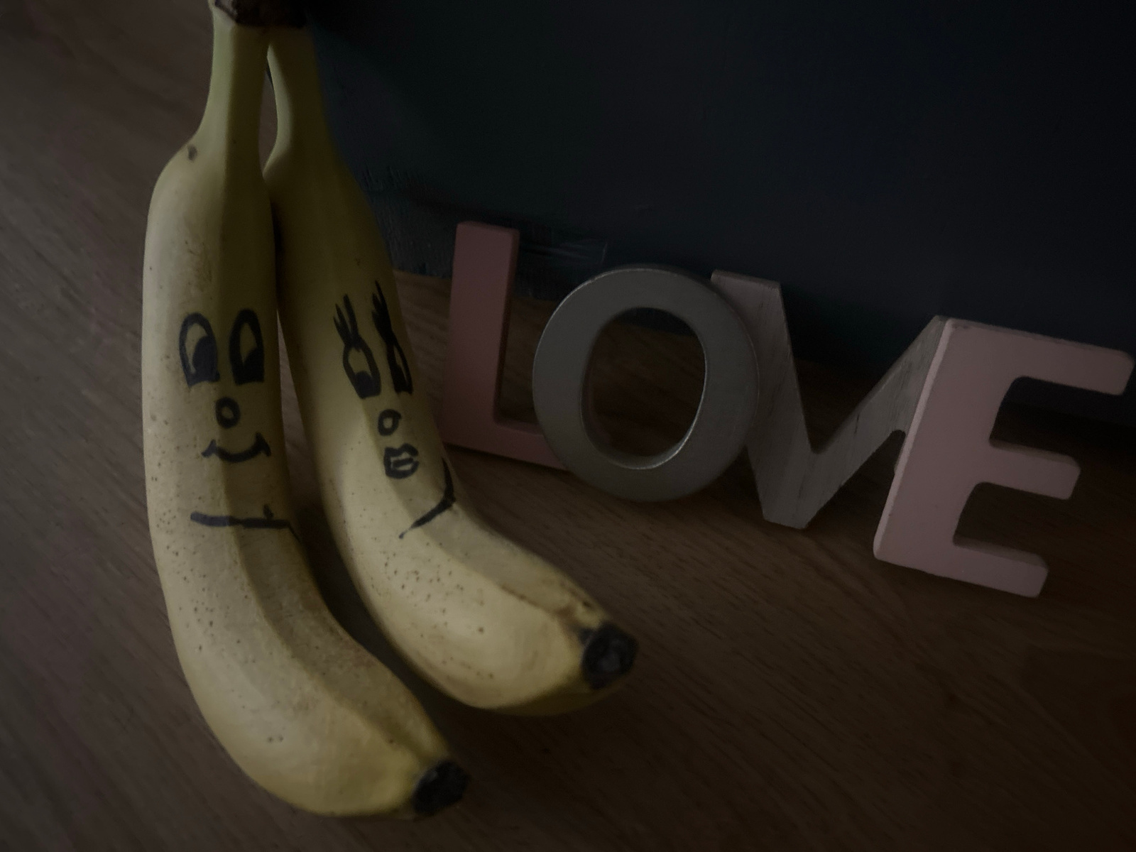 Two bananas are positioned on a wooden surface beside the word "LOVE" spelled out in individual wooden letters of varying colors: pink, silver, and white. Faces have been drawn on the bananas with a b…read more