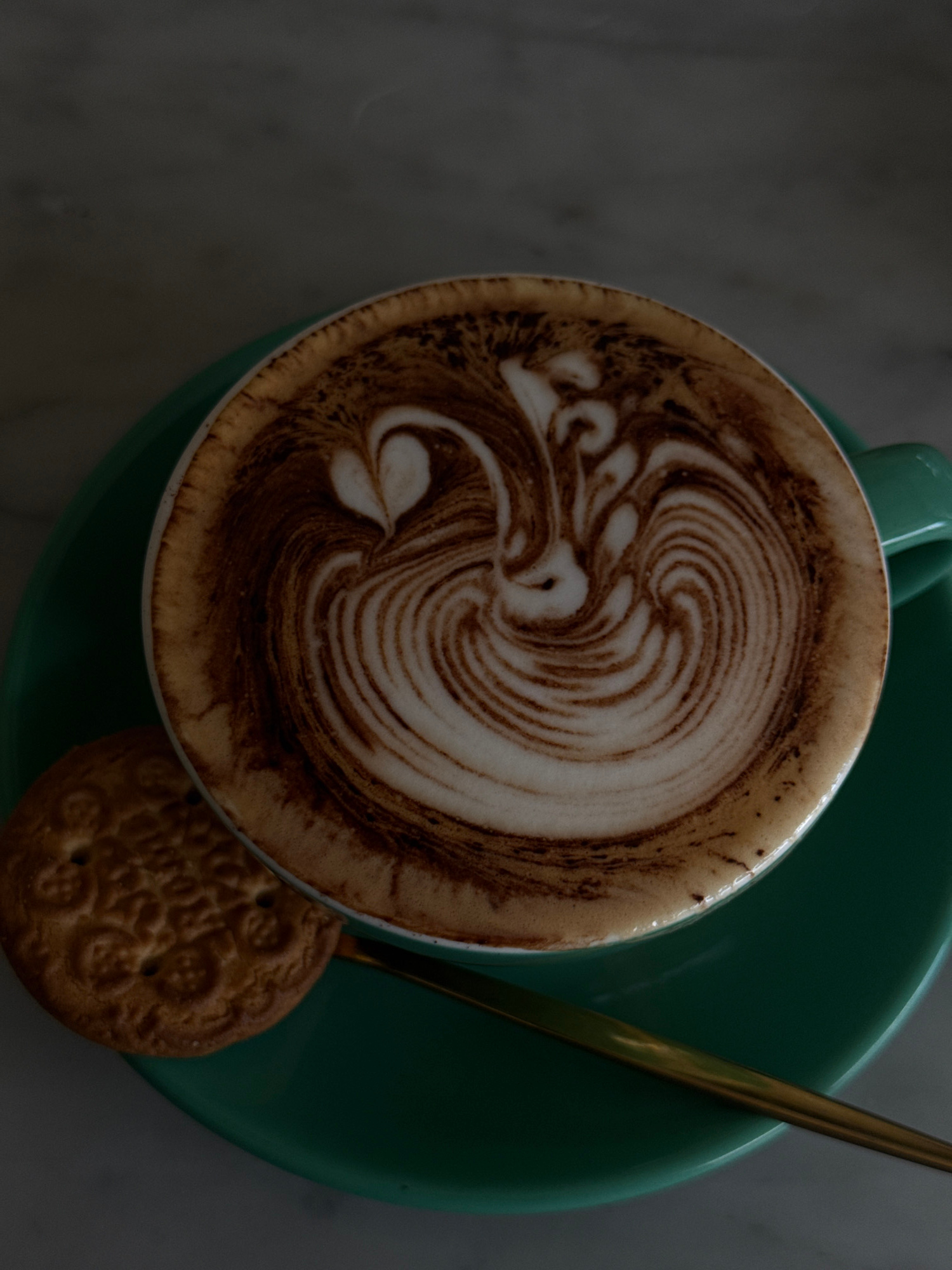 An overhead shot captures a beautifully crafted cup of latte art coffee, presented on a dark teal saucer. The coffee cup, also dark teal, is filled with a rich brown beverage topped with intricate whi…read more