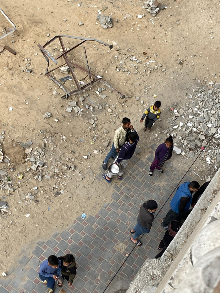 An overhead image depicts a street-level scene in Khan Yunis, Palestinian Territory. The ground is divided into two distinct areas: the majority of the frame, in the upper and central portions, is an…read more