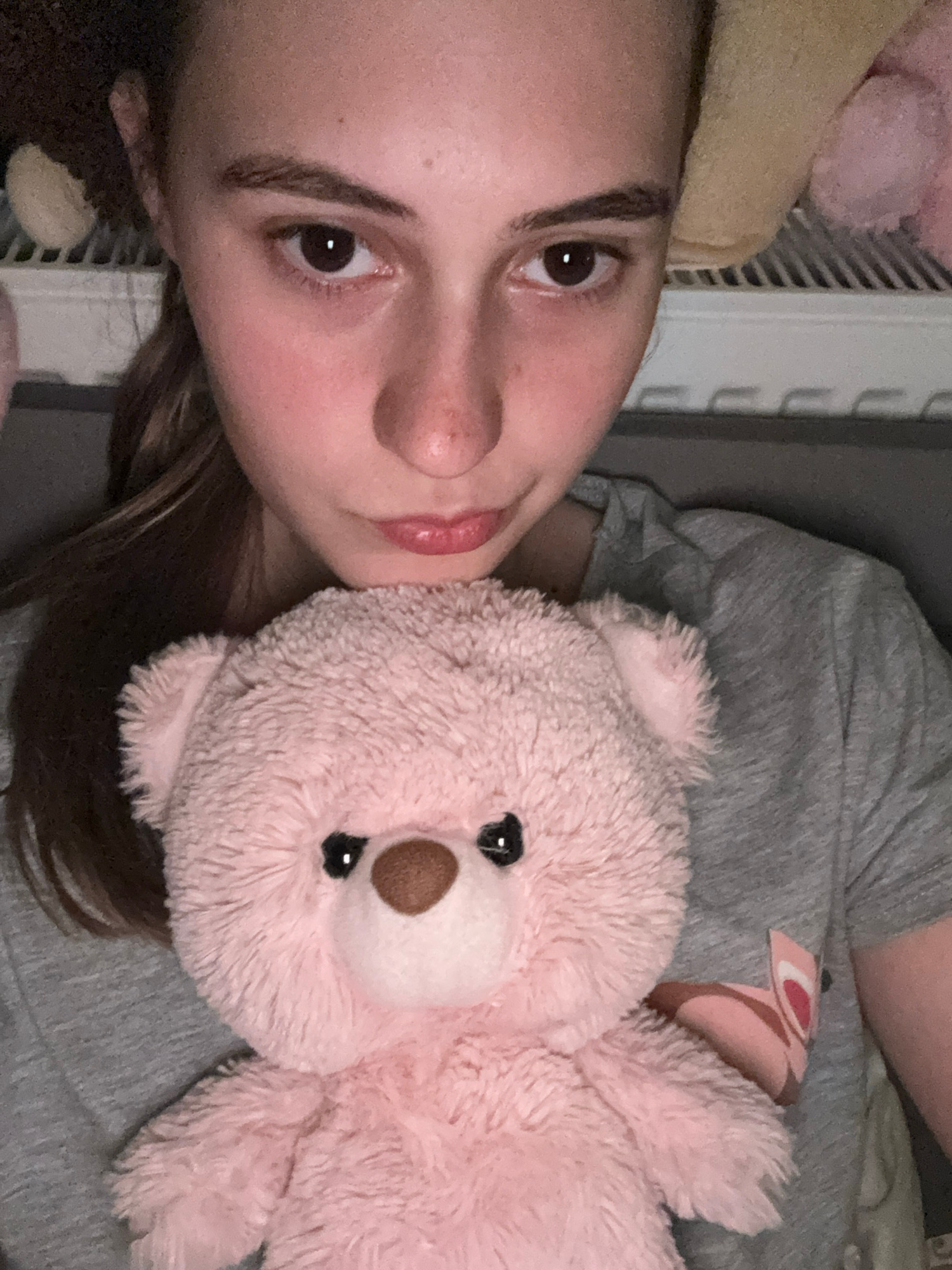 A woman is lying down, holding a pink teddy bear. The woman has brown eyes and hair. She is wearing a gray t-shirt. Part of a radiator and additional stuffed animals are visible in the background. The…read more