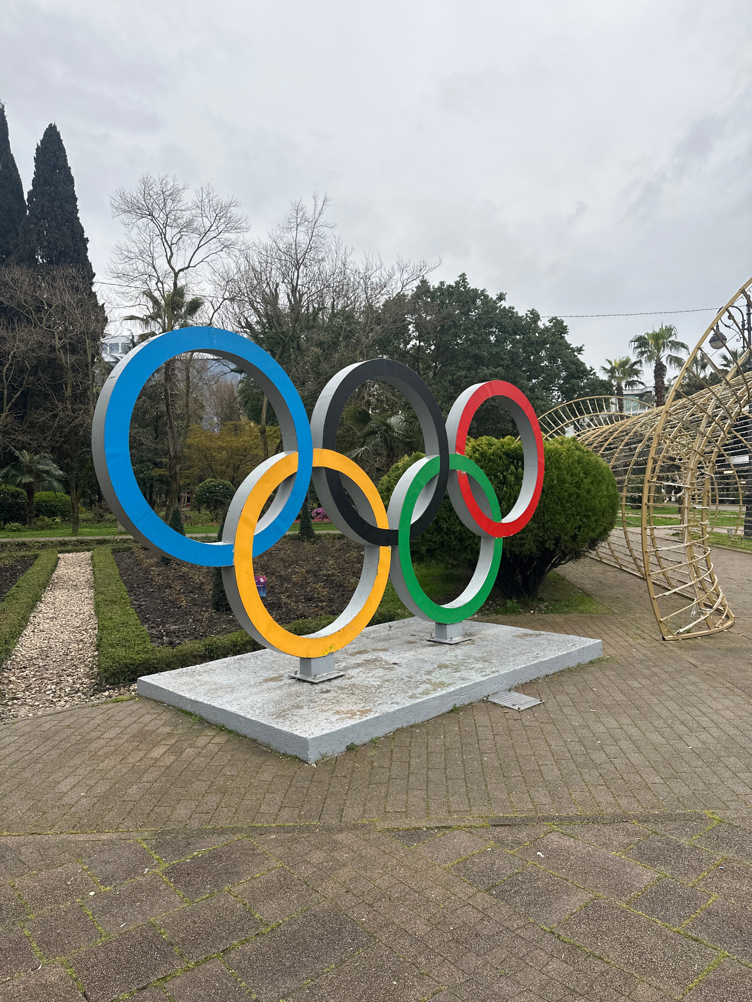 The image captures a statue of the Olympic rings in Sochi, Russia. The rings, colored blue, black, red, yellow, and green, are mounted on a concrete base. The background includes trees, a wrought-iron…read more