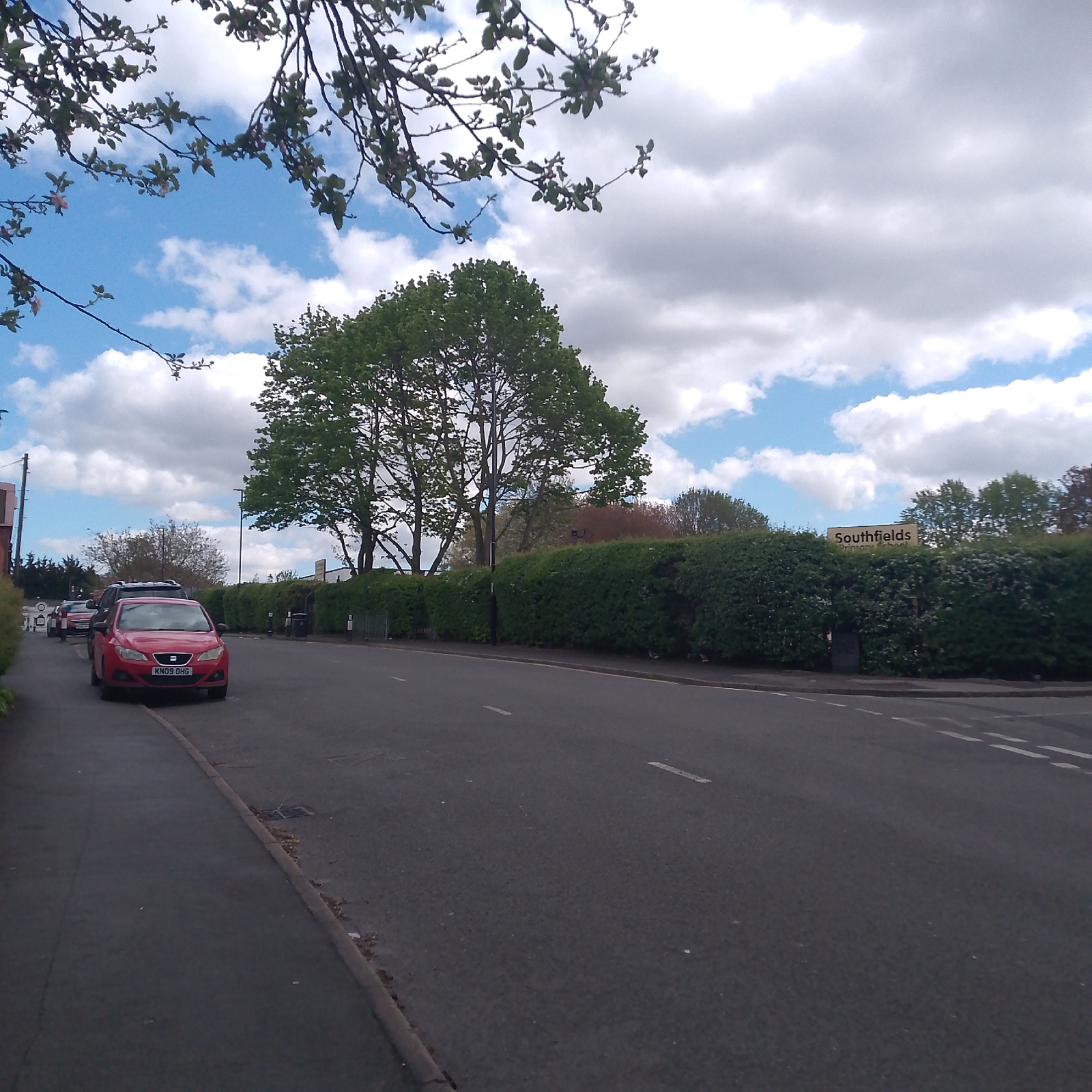 The image depicts a street scene in Coventry, United Kingdom, specifically in front of Southfields Primary School, as indicated by the school sign partially visible behind a hedge. A red car, registra…read more