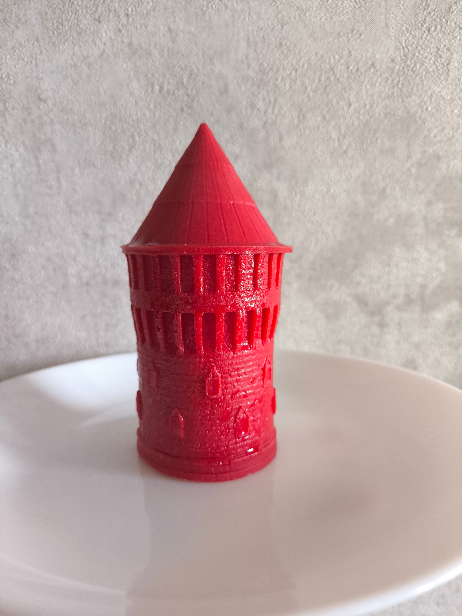 The image displays a vibrant red, miniature tower-shaped object standing centrally on a white, round plate. The tower features a conical roof with subtle horizontal ridges and a cylindrical body textuβ¦read more