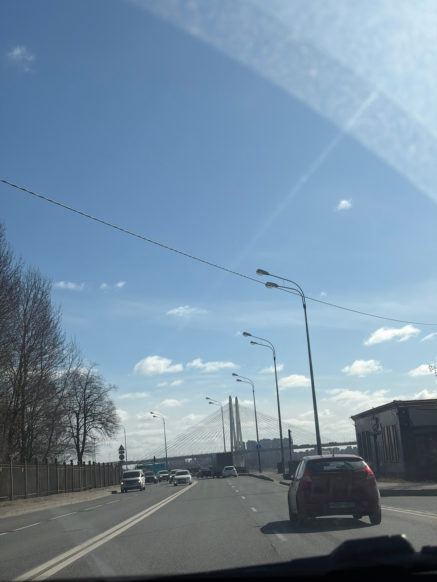 The image shows a view of a road with several cars and a bridge in the distance. The sky is blue with some clouds. The foreground includes a tree with bare branches and streetlights lining the road. I…read more