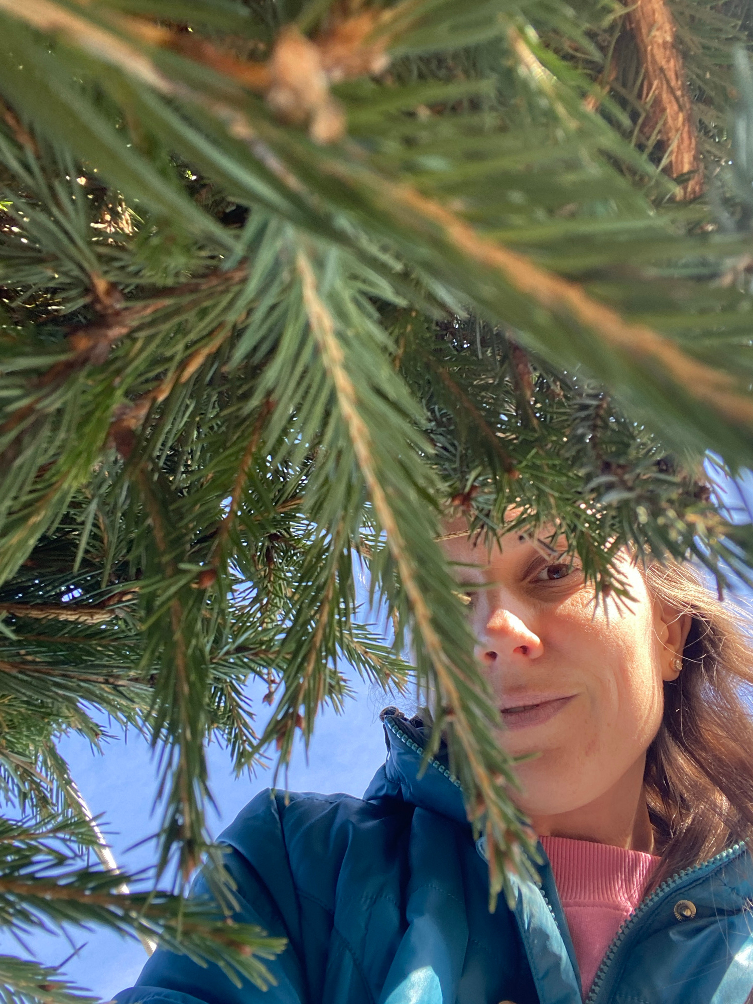 A low-angle, upward-facing photograph depicts a woman partially visible through a dense cluster of coniferous branches, likely from a fir or spruce tree. The woman's face, framed by brown hair, is ang…read more