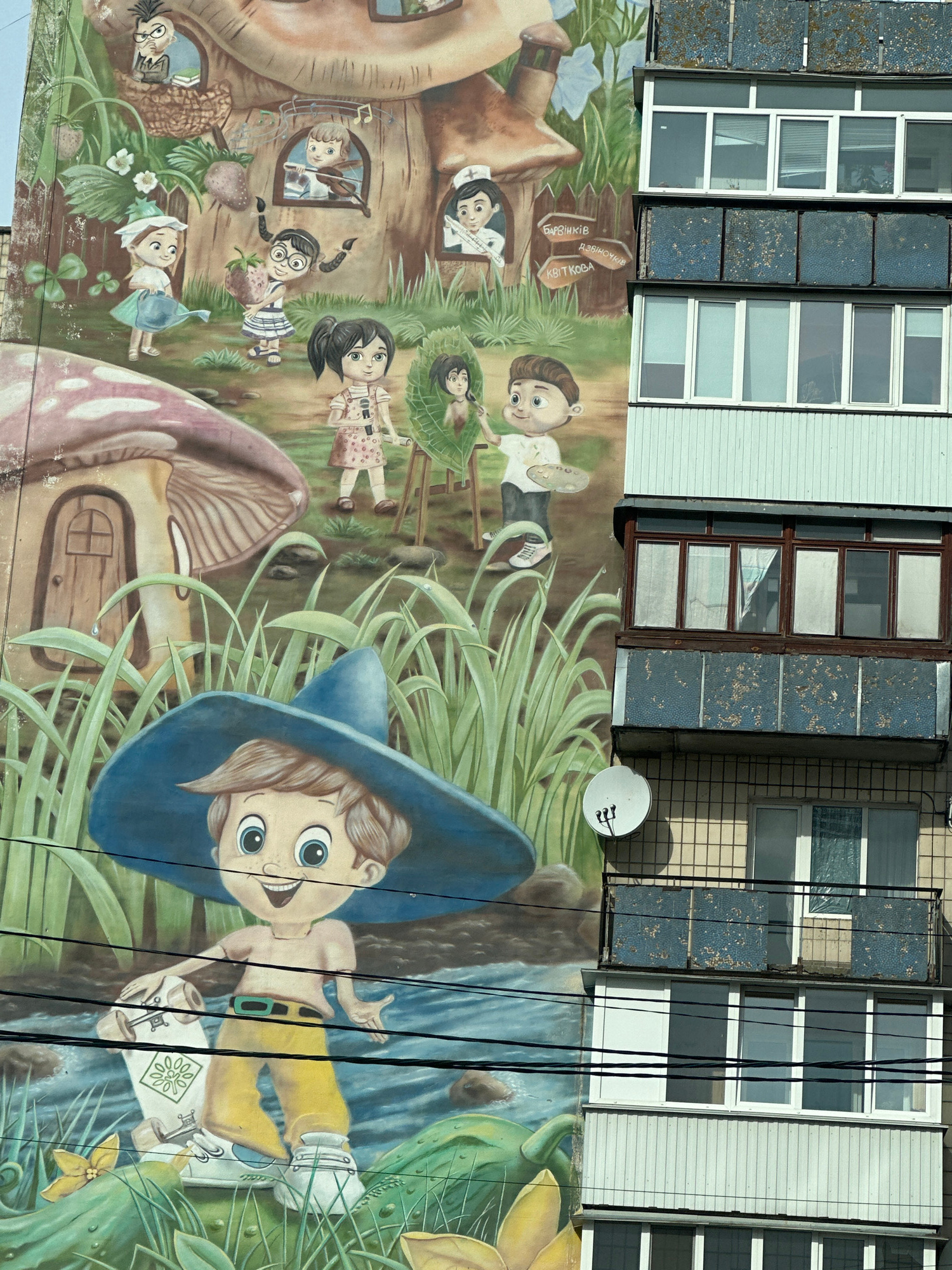 A street-level, high-angle shot depicts a large mural adjacent to an apartment building. The mural features cartoon-like figures, including children, amidst whimsical mushroom houses and flora. In the…read more