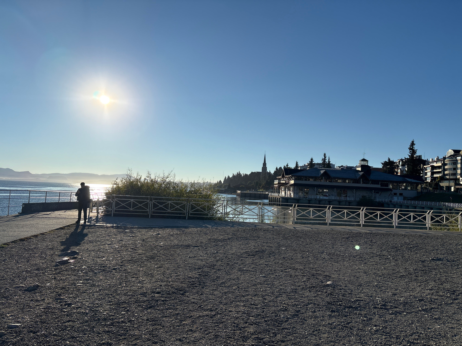 The image captures an outdoor scene in San Carlos de Bariloche, Argentina, along the shore of what is identifiable as Lake Nahuel Huapi. The foreground features a wide area of dark gray, coarse gravel…read more