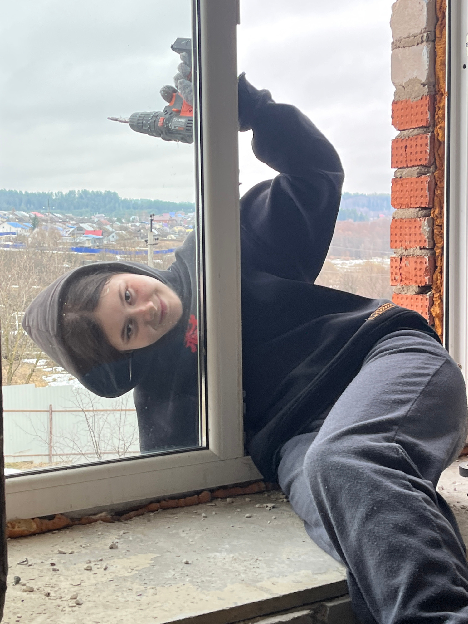 A person is installing a window. The person in the window reflection is facing the camera. A drill is being held up outside the window and is reflected in the window's glass. Outside the window is a n…read more