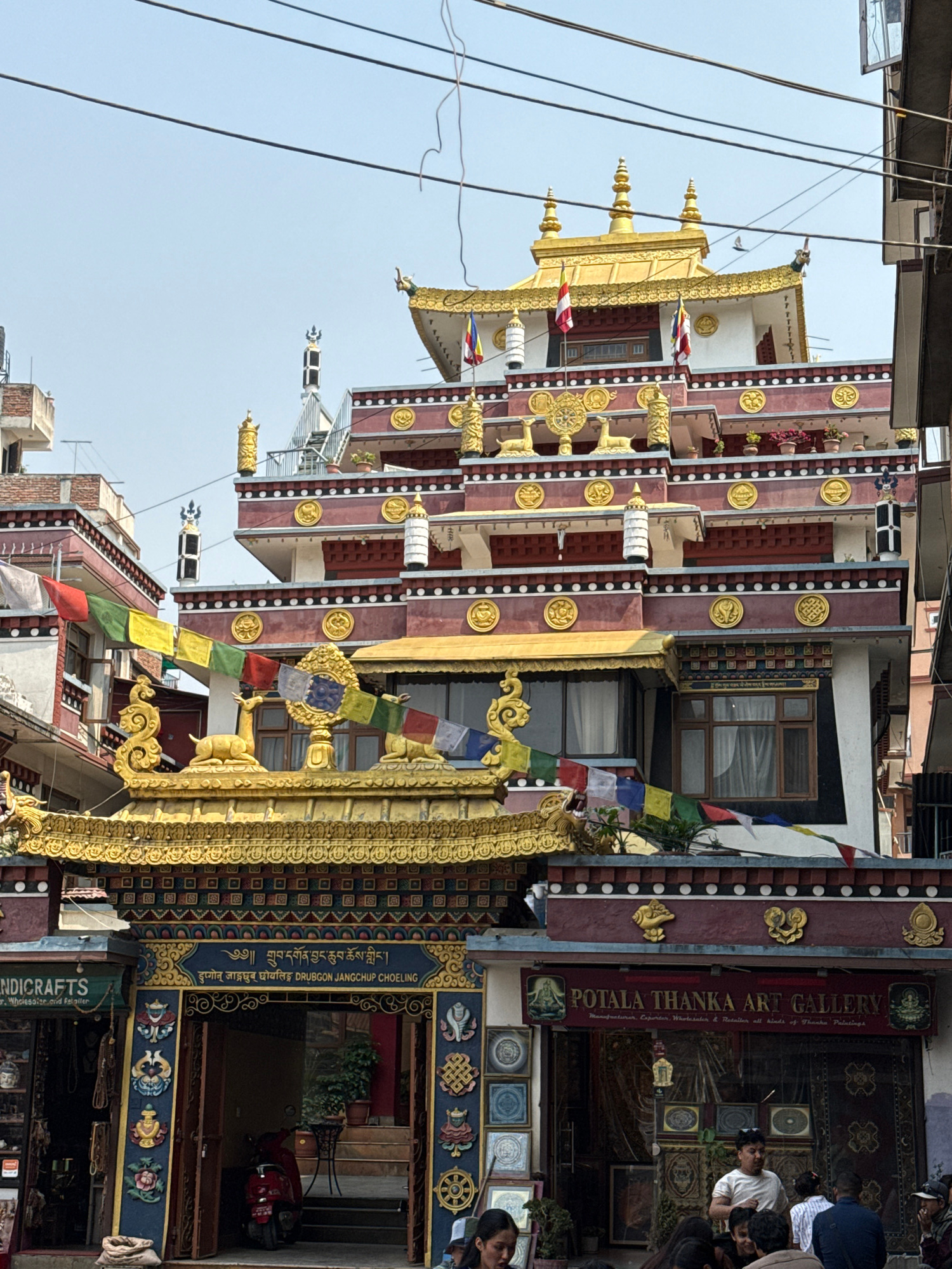 The image shows a multi-tiered building in Kathmandu Metropolitan City, Nepal, exhibiting traditional Buddhist architectural elements. The structure features maroon and white sections with gold detail…read more
