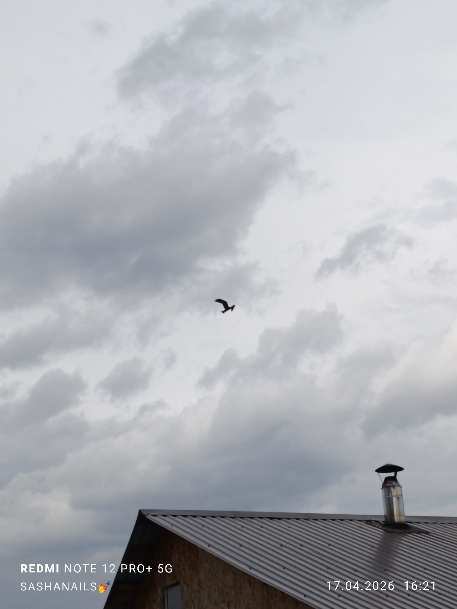 The image displays an outdoor scene under an overcast sky filled with gray clouds. A single dark bird is captured in silhouette, flying with outstretched wings against the cloudy backdrop in the upper…read more