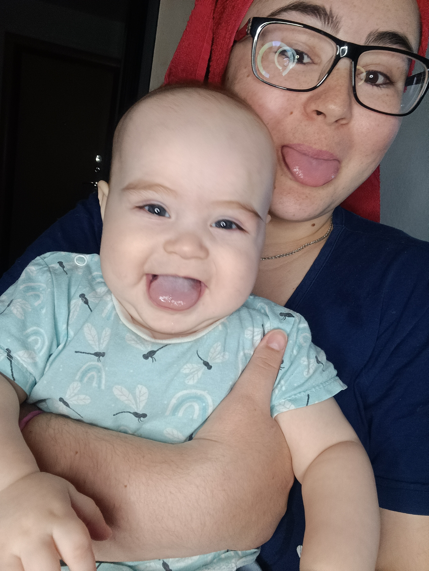 A medium shot depicts a woman holding a baby. The woman is wearing glasses and has a red towel wrapped around her head. She is sticking her tongue out. The baby, wearing a light blue shirt with a drag…read more