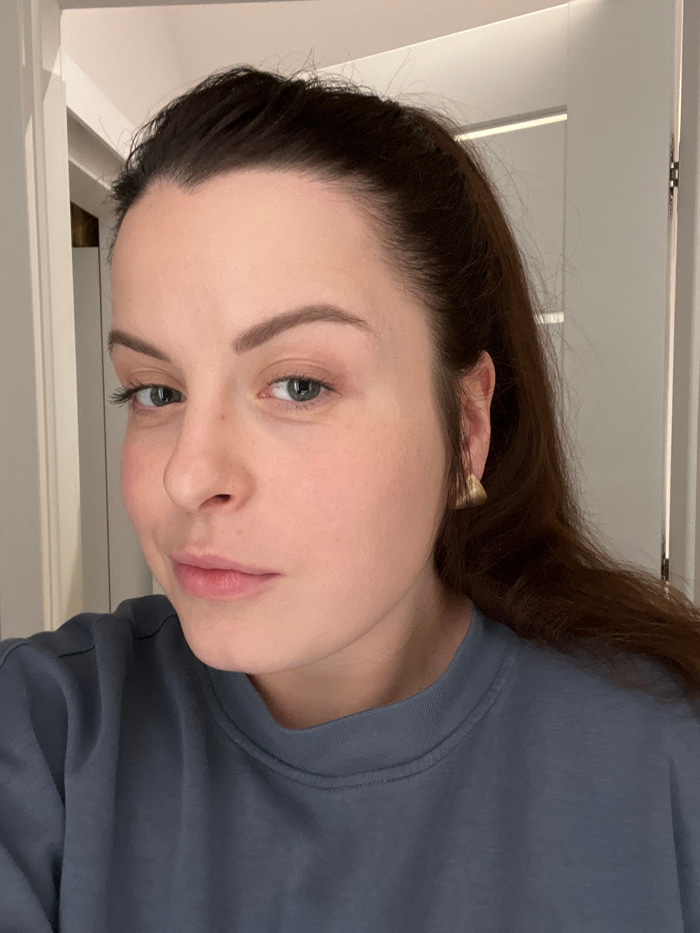 The image depicts a female subject in a headshot portrait, situated within an interior room. The subject has fair skin, dark brown hair pulled back, light blue-grey eyes, and defined light brown eyebr…read more
