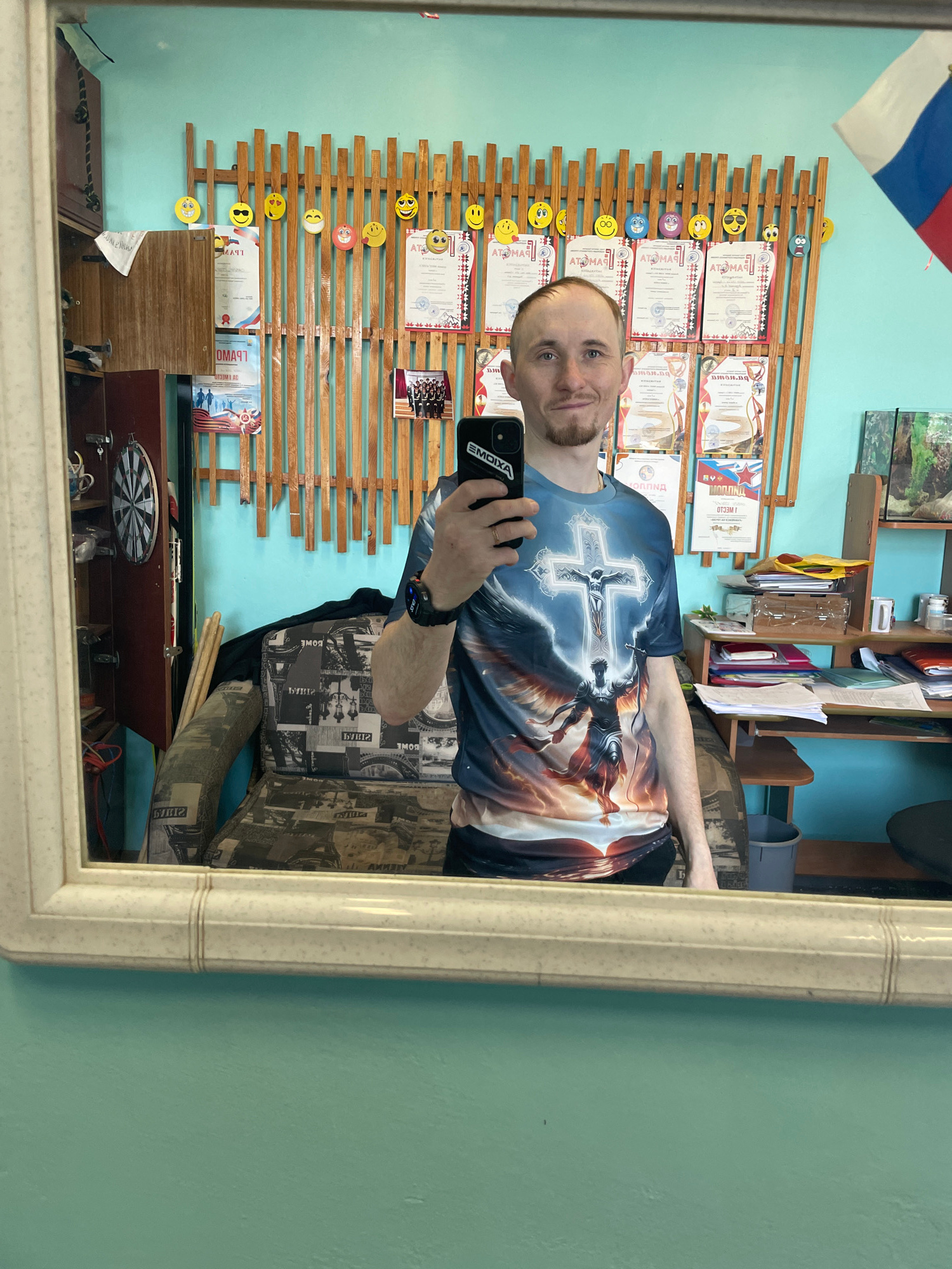 A Caucasian male with thinning hair and a short beard is seen in a mirror reflection, holding a black smartphone with the word "EMOIXA" displayed. He wears a t-shirt with a stylized cross and angel wi…read more