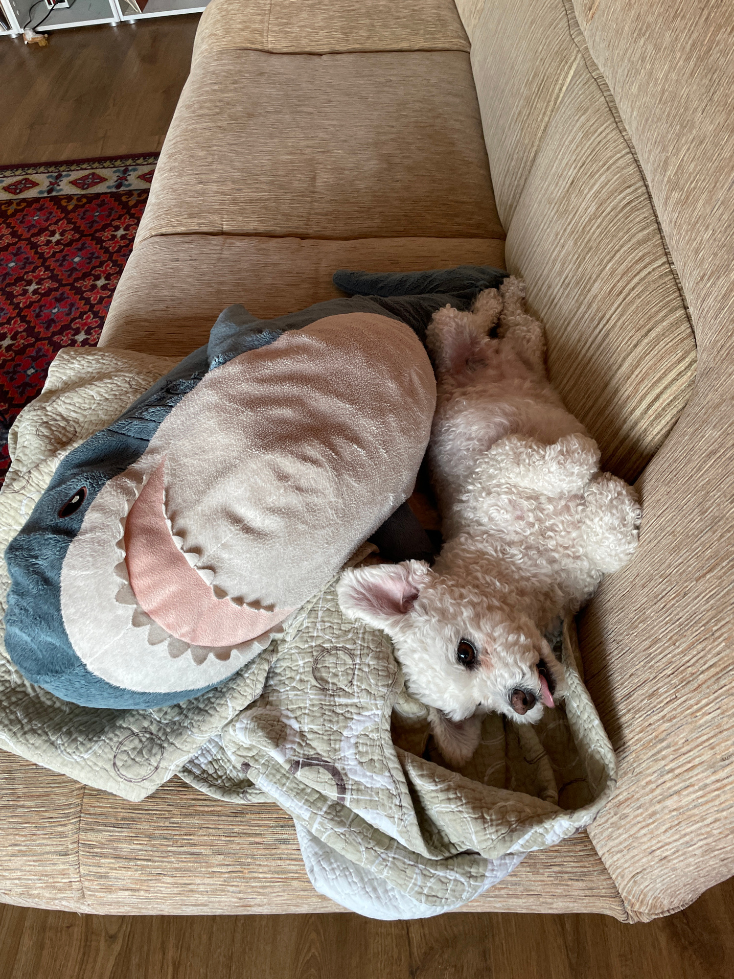 A white, fluffy dog is lying on its back on a beige couch, next to a large, plush shark toy and a beige and white patterned quilt. The dog's tongue is slightly sticking out. Part of a rug with a red a…read more