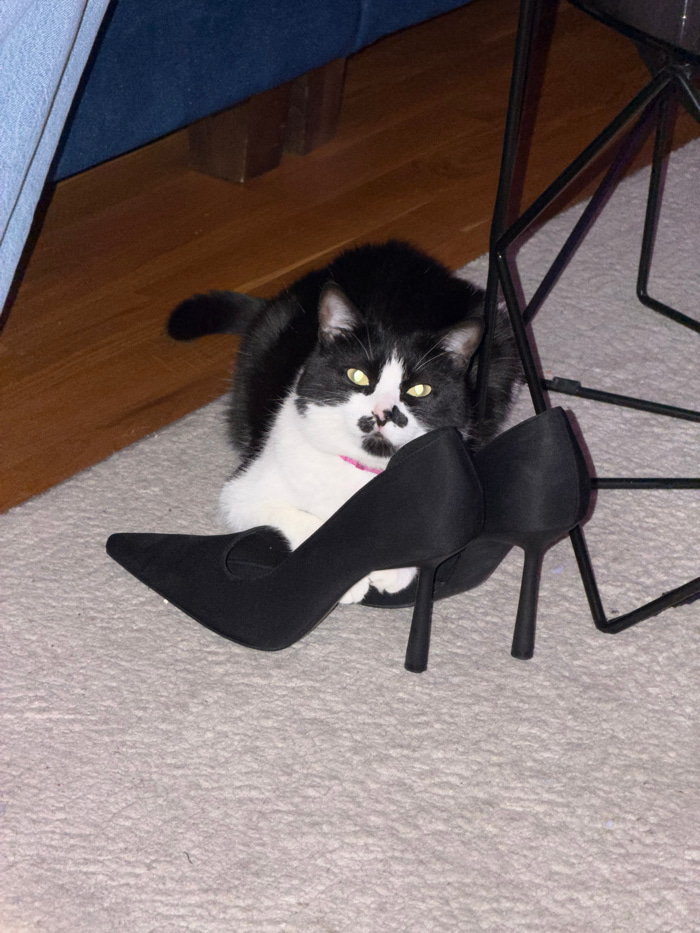 A black and white cat with yellow eyes peers out from under a black metal chair and black heels. The cat has a pink collar and spots of black on its nose. The cat is lying on a carpeted floor next toβ¦read more