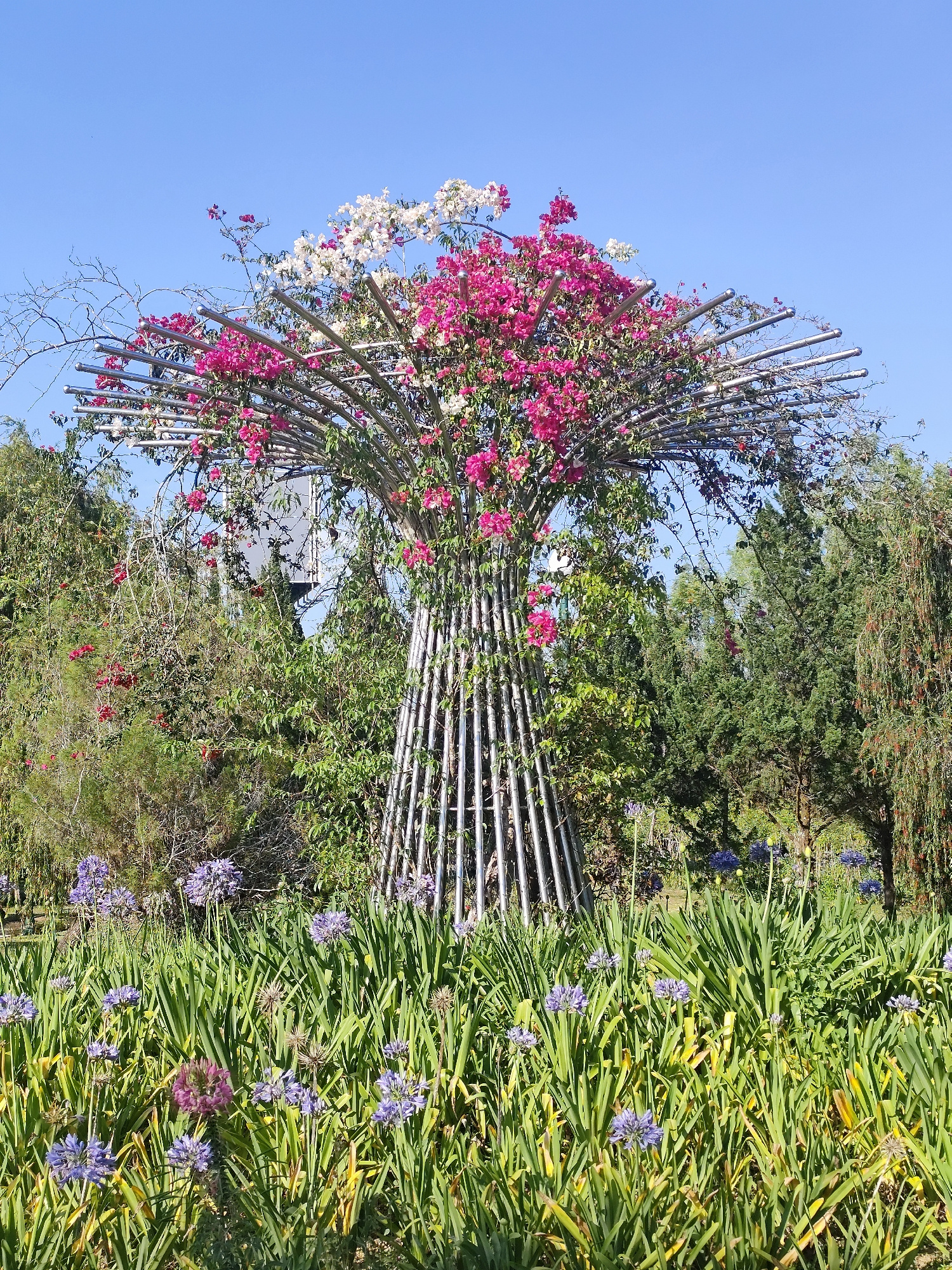 A vibrant scene unfolds under a clear, cloudless blue sky. The foreground showcases a lush array of green foliage dotted with clusters of purple and blue agapanthus flowers, their tall stems reaching…read more