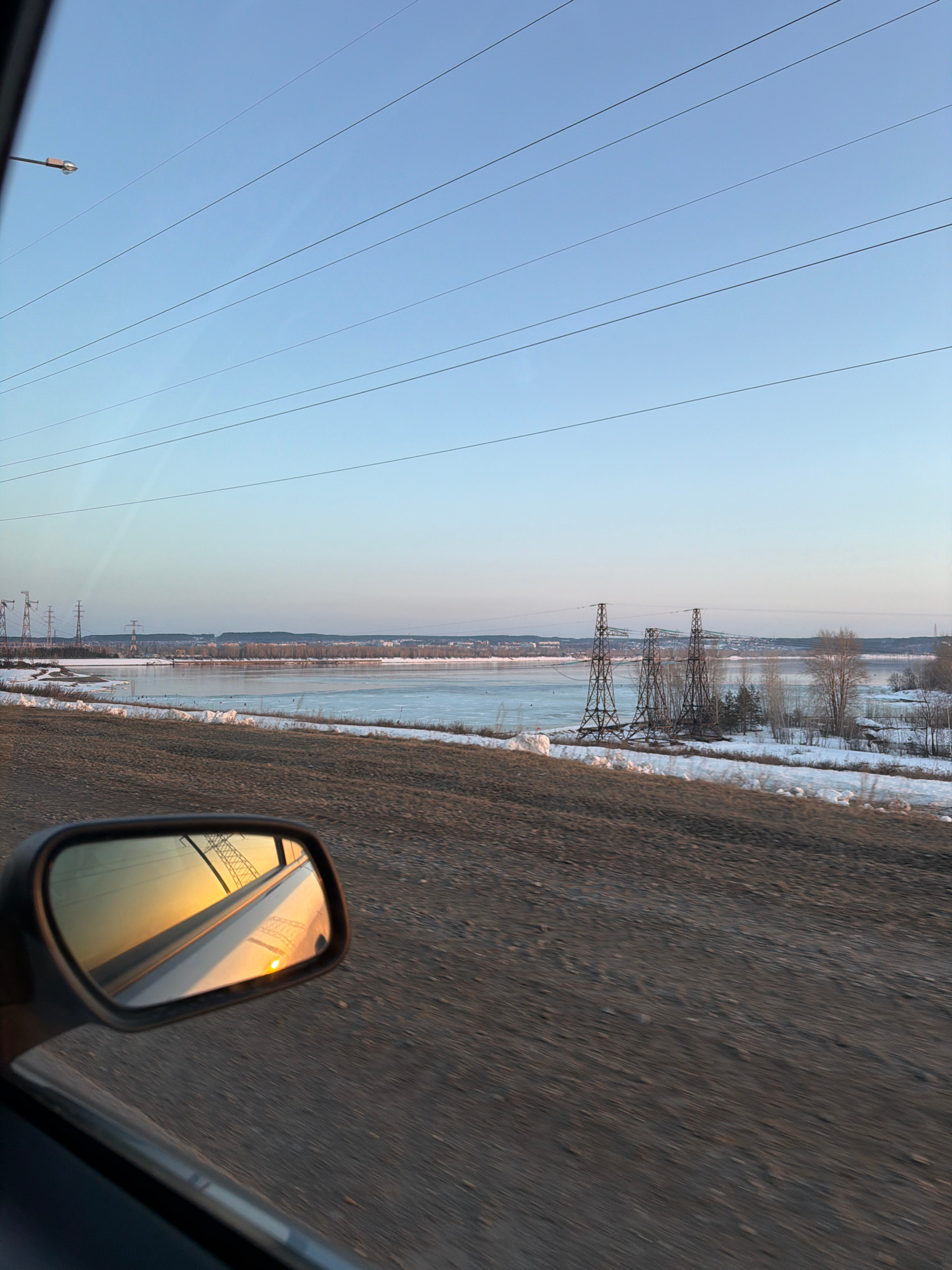 The image depicts a winter or early spring landscape in Noviy, Russia, viewed from the interior of a moving vehicle, looking outward through the passenger-side window. The scene is illuminated by theβ¦read more