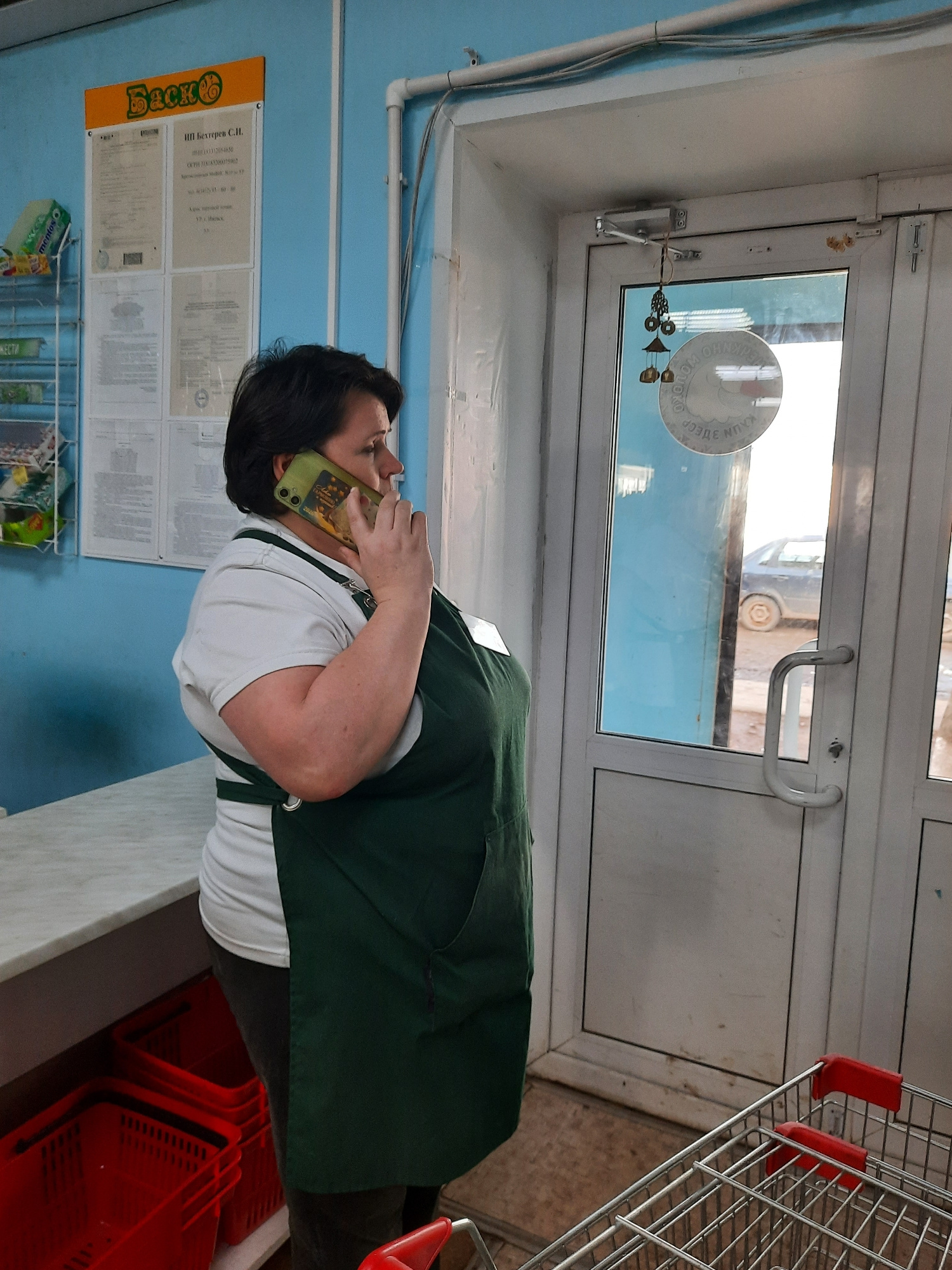 A woman wearing a white t-shirt and a dark green apron is talking on a cell phone inside a store. The phone has a green case. The woman has dark hair. Behind her, a blue wall displays posters and a ra…read more