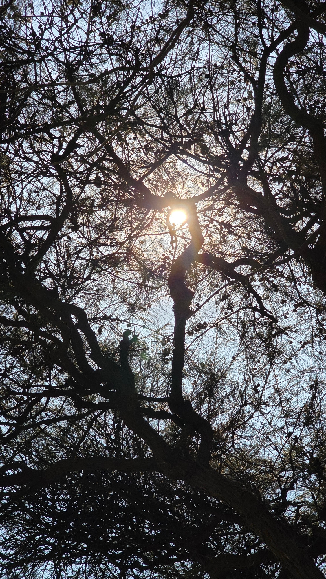 The photograph captures a low-angle view through the dense branches of a tree against a pale sky. The sun is visible through the branches, creating a bright, starburst effect. The branches are dark an…read more
