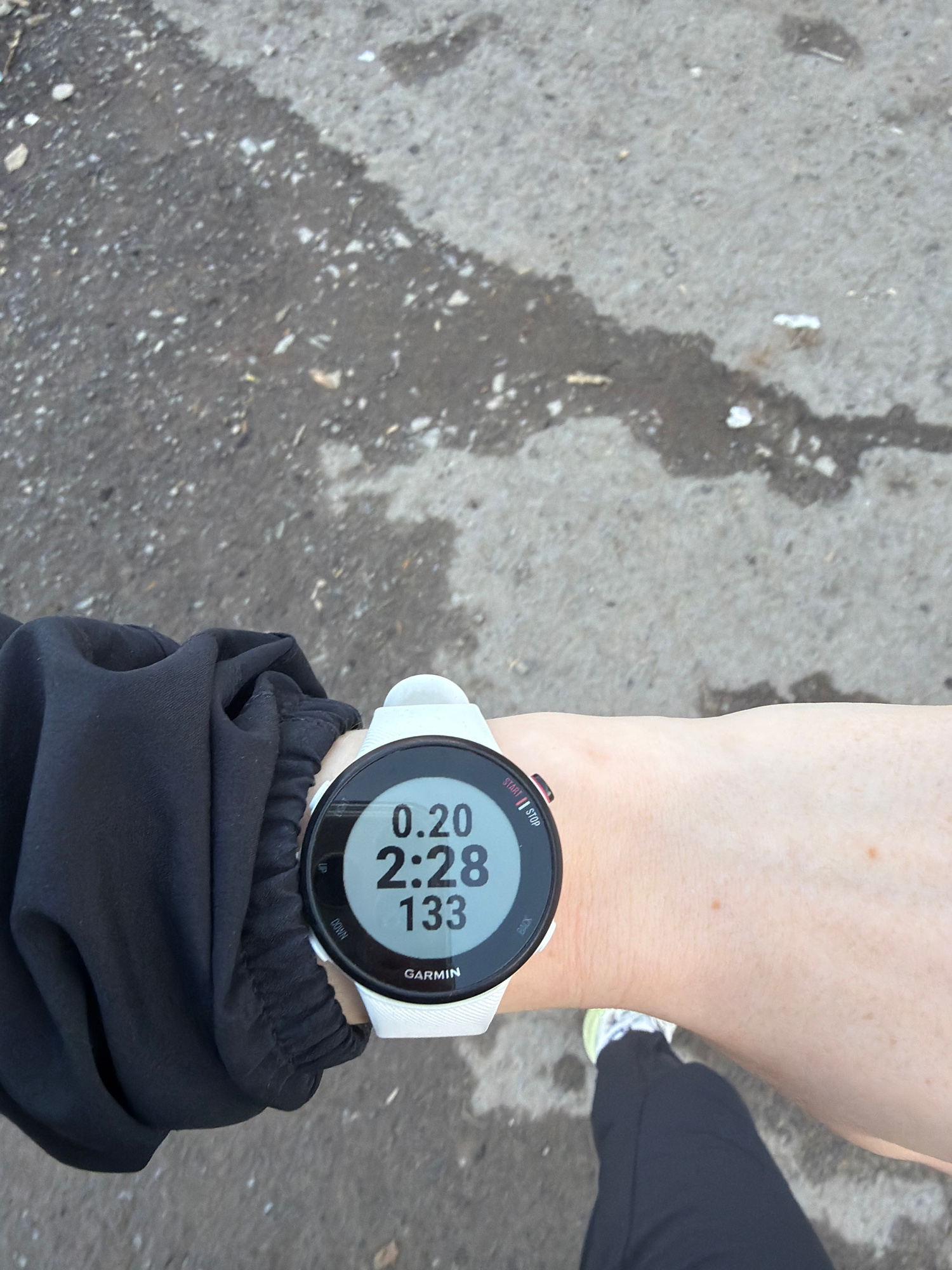 A first-person perspective photograph shows a person's wrist with a white Garmin smartwatch displaying 0.20, 2:28, and 133. The person is wearing a black long-sleeved garment. Part of a running shoe w…read more