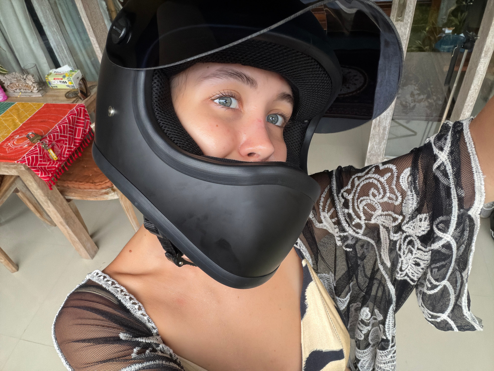 A person with light skin and blue eyes is centered in the image, wearing a full-face black motorcycle helmet with the visor partially raised. They are also wearing a sheer black top with white floral…read more