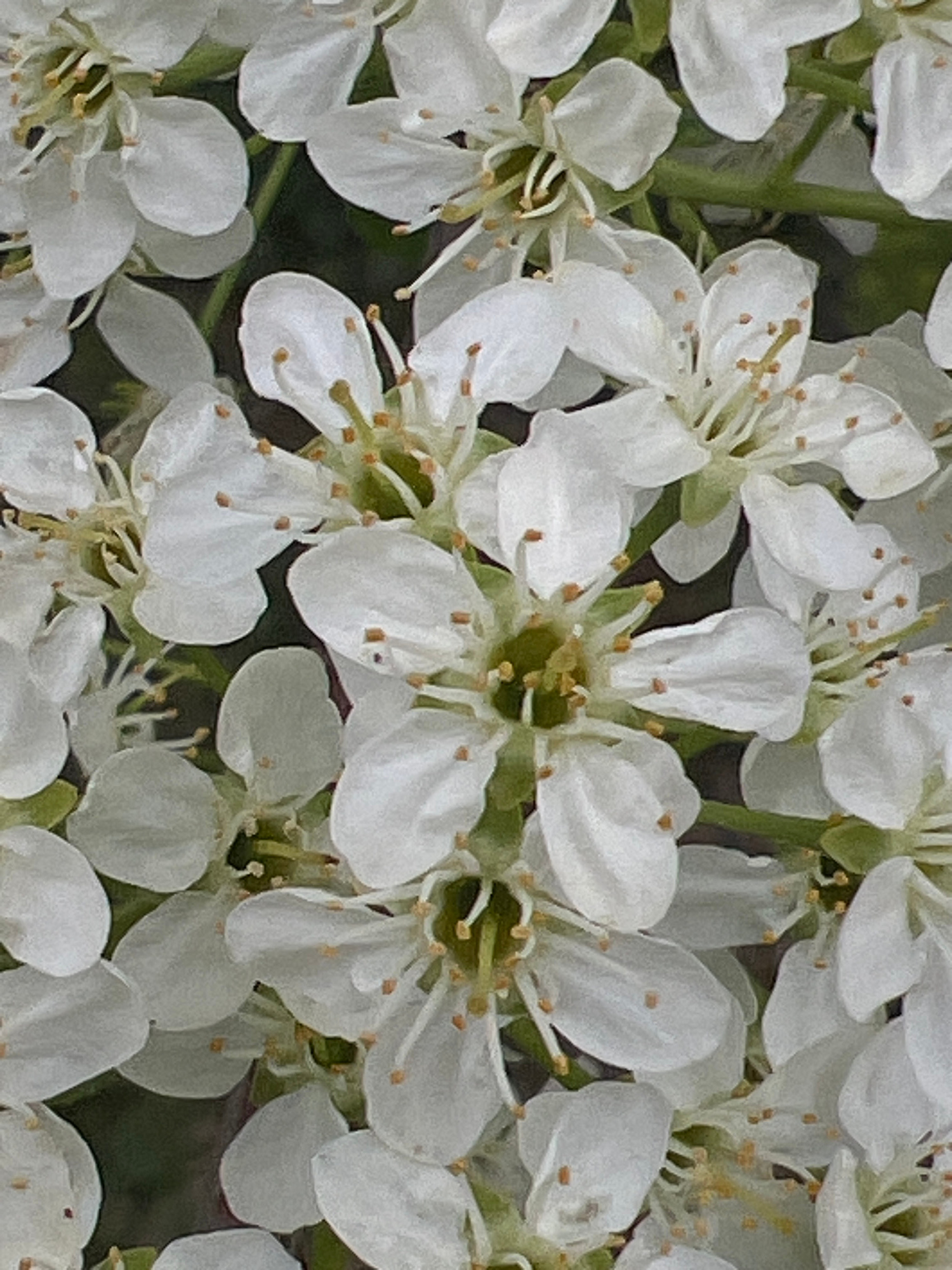 Close-up view of white blossoms. The image contains numerous flowers with five white petals each, arranged in a dense cluster. The centers of the flowers display visible stamens with yellow tips. The…read more