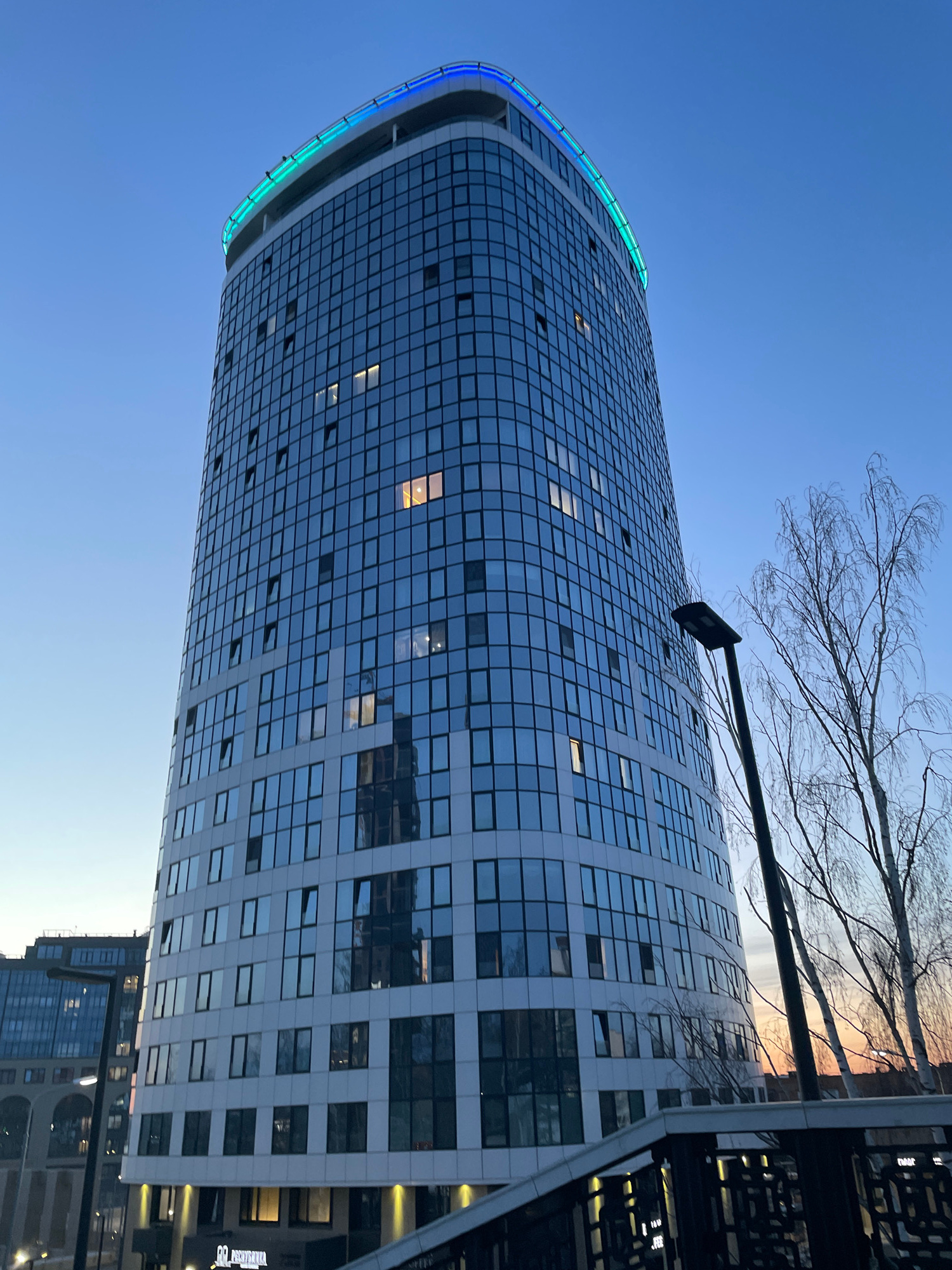 A tall, cylindrical building dominates the scene, situated in Izhevsk, Russia. The building has a grid-like facade comprised of numerous windows, some of which have lights on inside. The top of the bu…read more