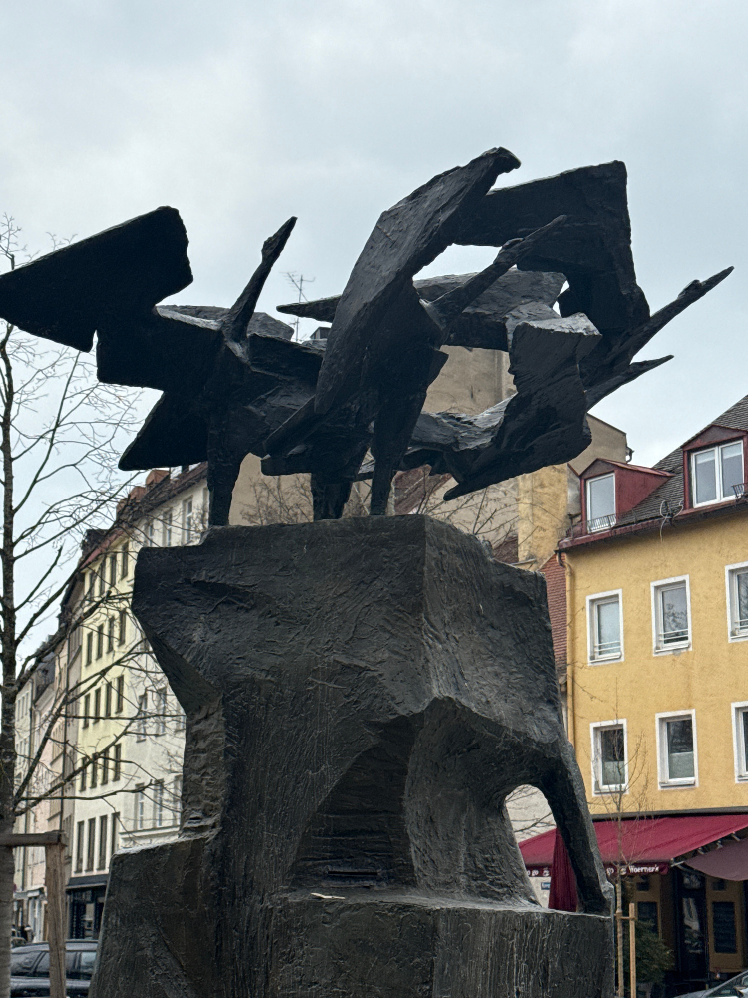 View of the “Fragment Statue” by Herbert Baumann. It is located in Munich, Germany in front of the Amerika Haus. The statue is an abstract sculpture of dark-colored metal. The background shows buildin…read more