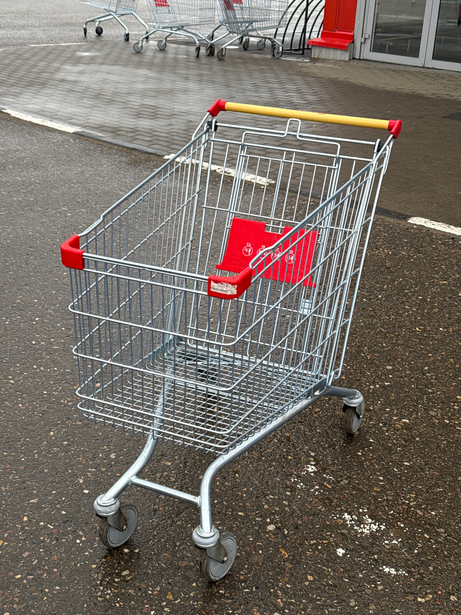 The image shows a shopping cart on wet asphalt, presumably in Ново-Никольское, Russia. The cart is silver metal with a yellow handle and red plastic accents. It sits on the asphalt with other carts be…read more