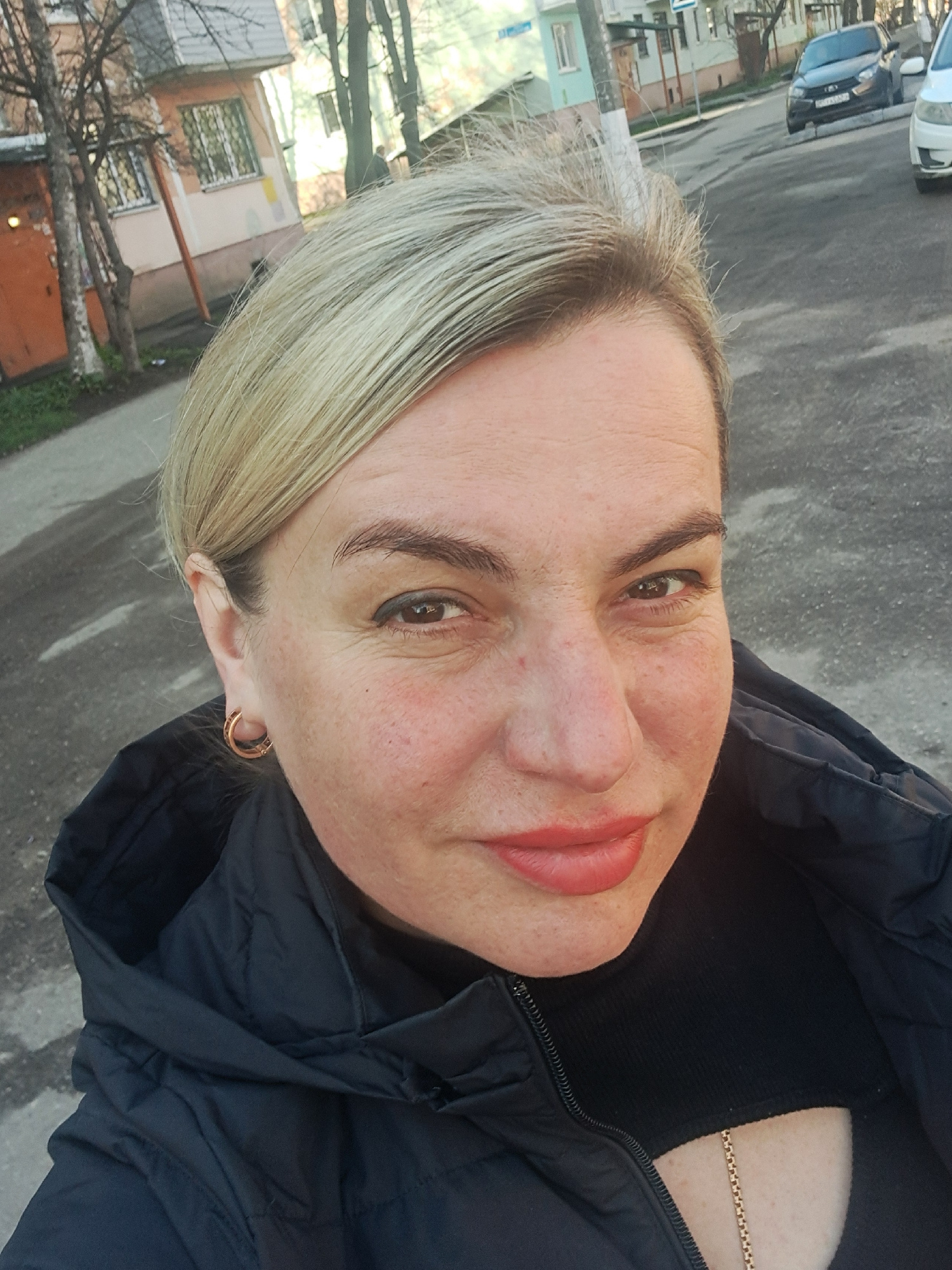 A woman with short, light blonde hair is taking a selfie. She is wearing a black jacket and a black top. A gold chain is visible around her neck. She has light skin, dark eyebrows, and is wearing lips…read more