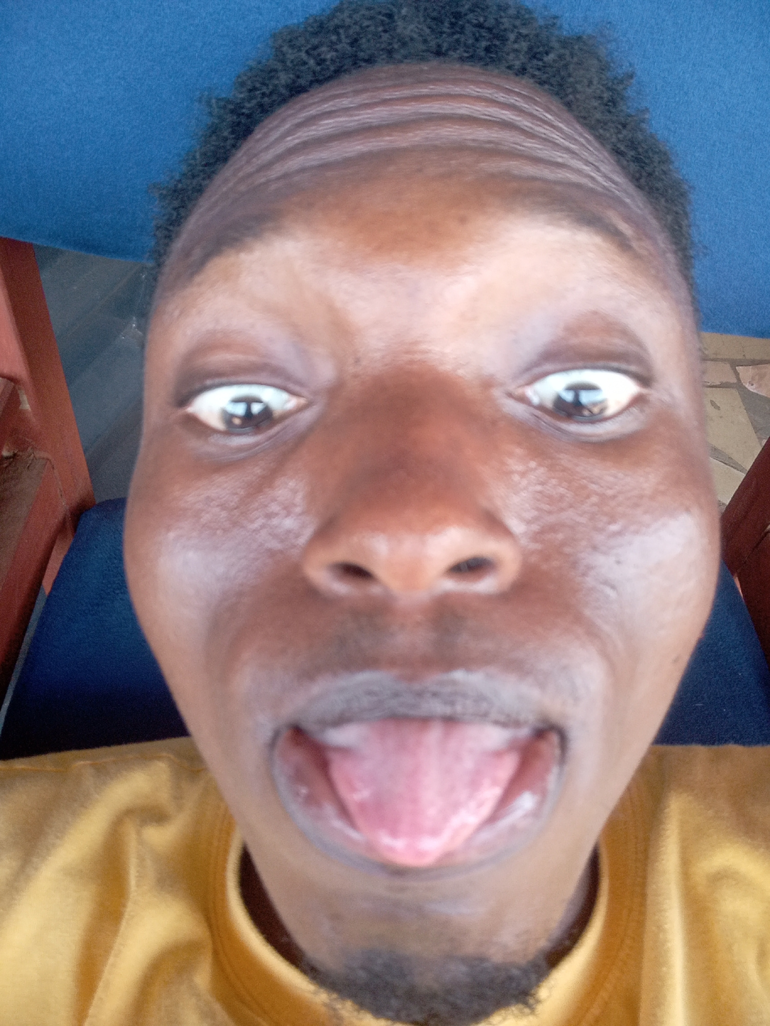 A close-up, wide-angle portrait features an adult with dark skin and short, curly dark hair, looking directly at the camera. The wide-angle lens distorts the facial features, making the forehead appea…read more