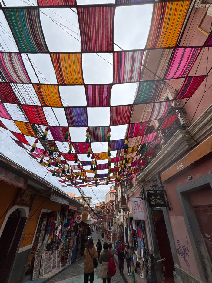 A narrow street is bustling with people and vendors, their wares displayed along the sidewalks. Above, colorful striped fabrics are strung in a grid pattern, creating a canopy over the street. The fab…read more