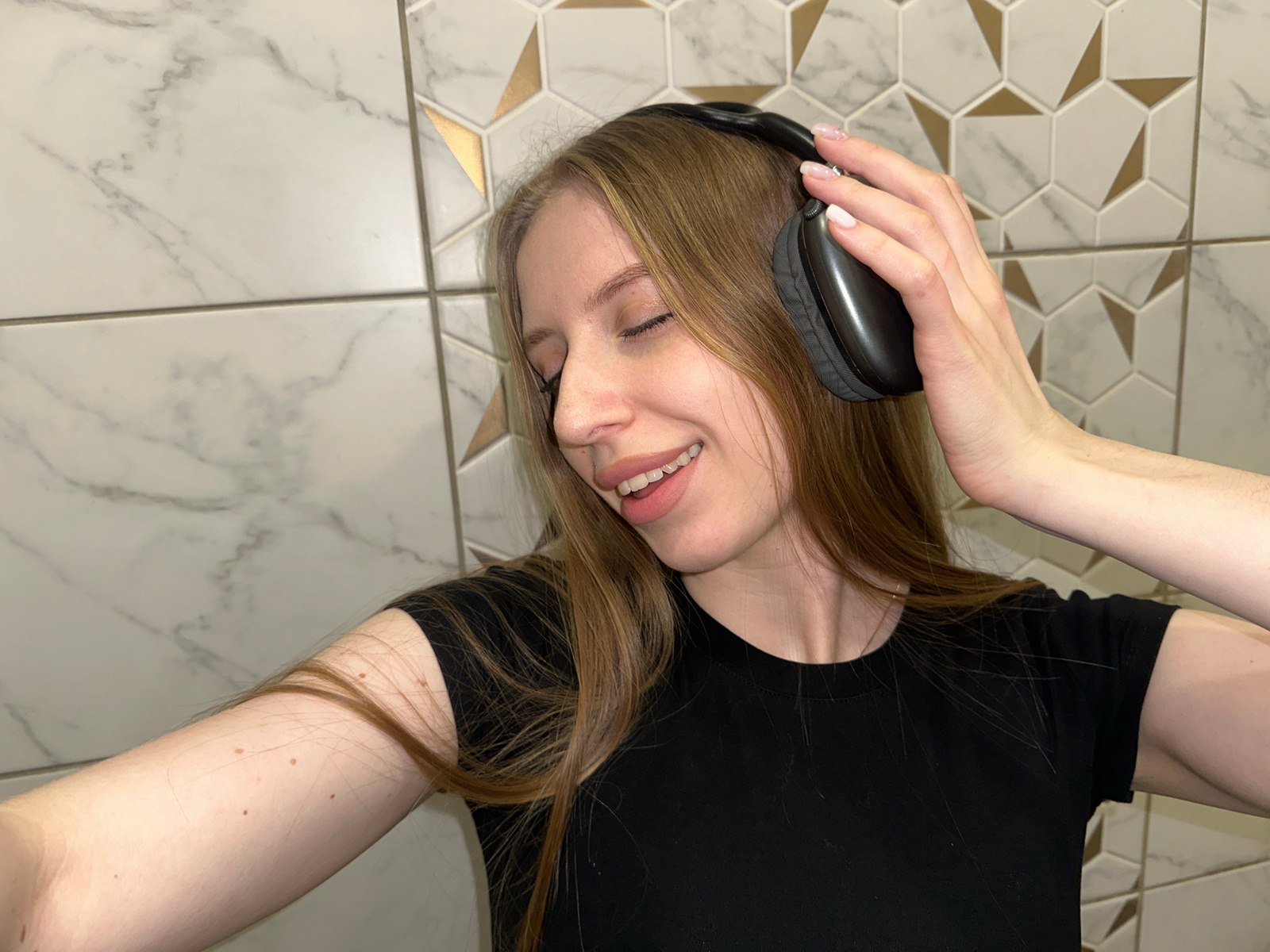 A young woman with fair skin and long, light-brown hair lies on a tiled floor with a black t-shirt, headphones in hand. The floor has a white marble-like pattern with geometric accents. Her eyes are c…read more