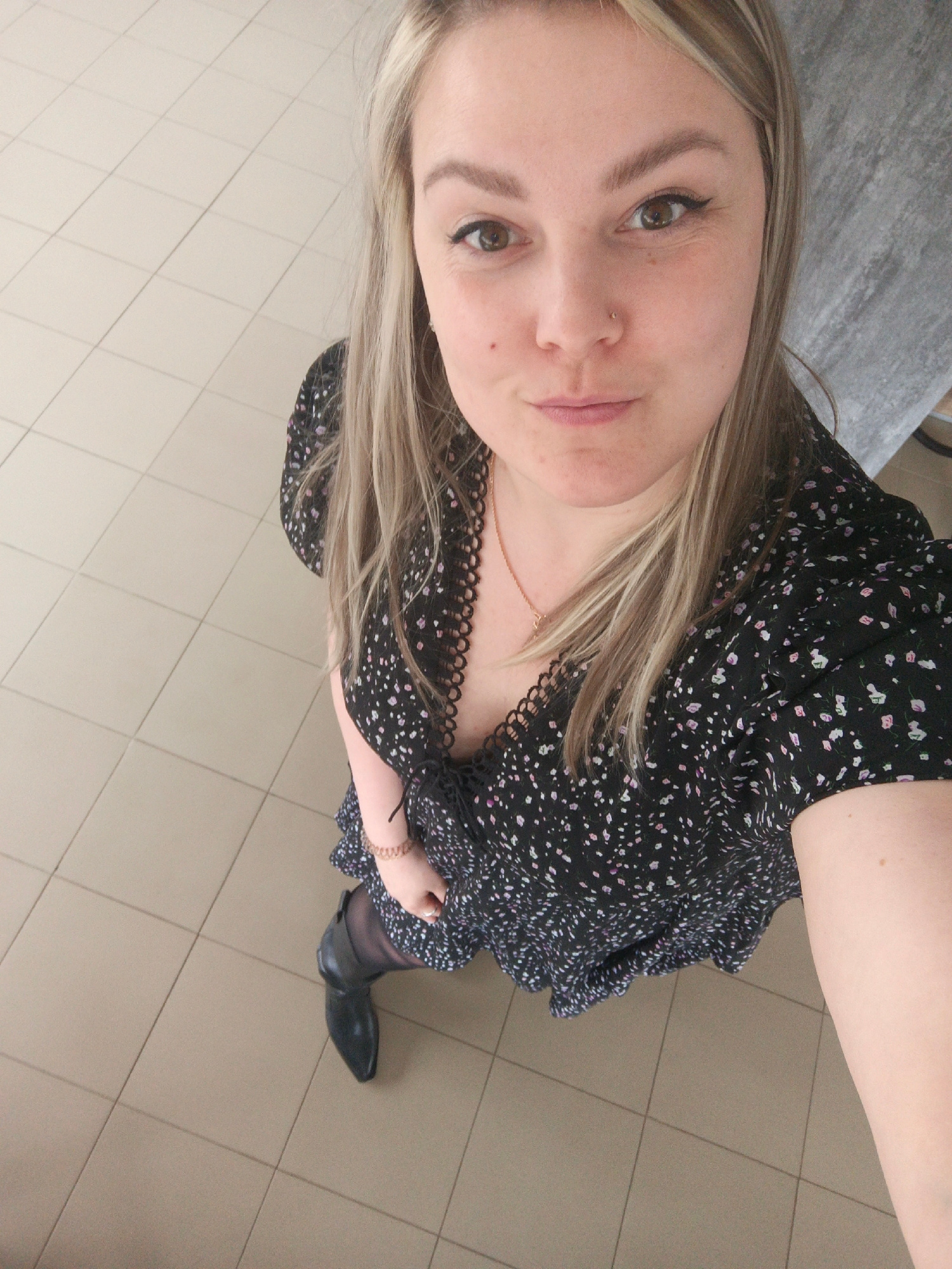 A woman is taking a selfie from a high-angle perspective. She has blonde hair, fair skin, and is wearing a black dress with a floral pattern and lace trim. She is also wearing dark tights and black sh…read more