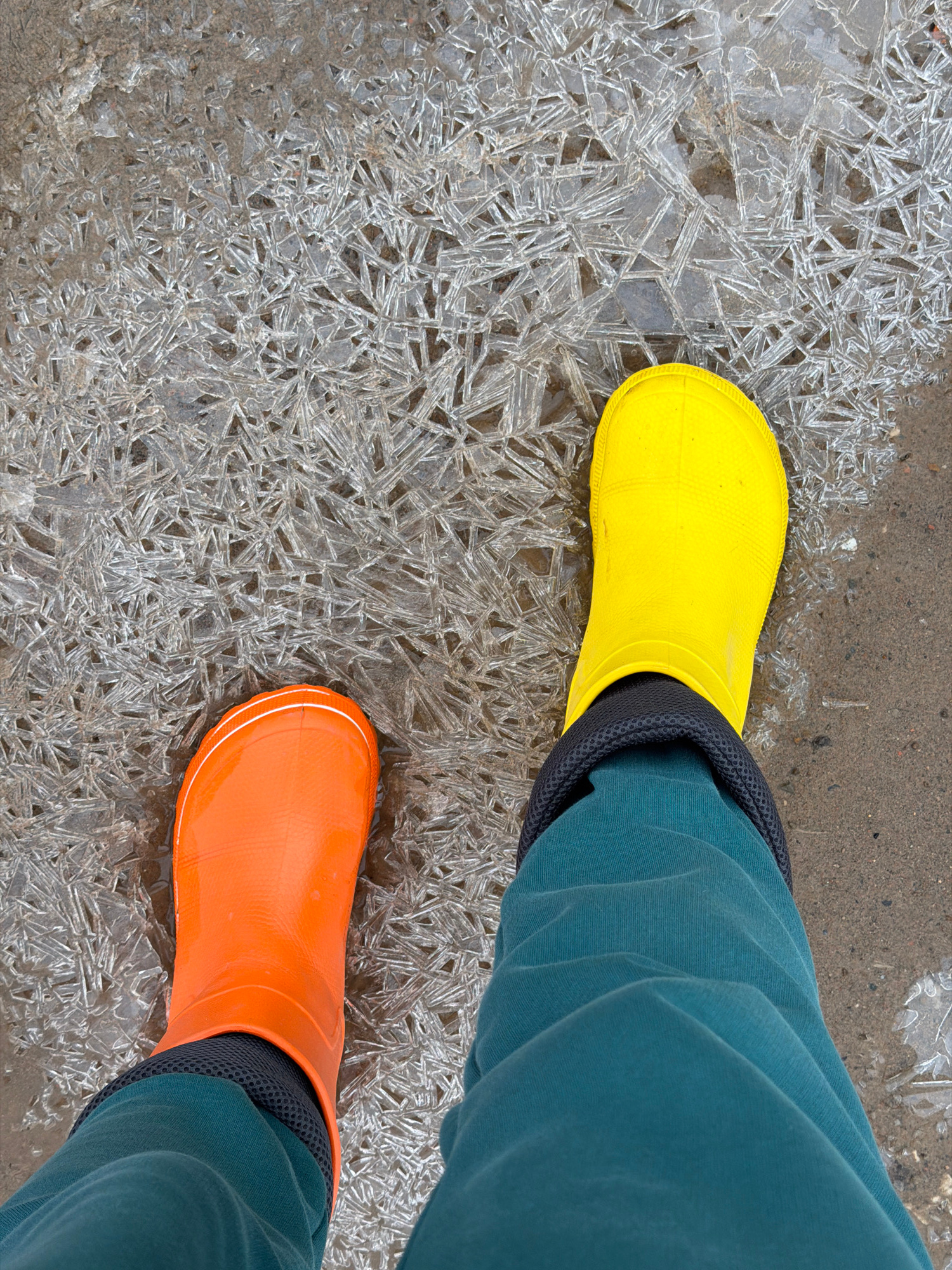A person is standing on a layer of ice with a yellow rain boot on the left foot and an orange rain boot on the right foot. The ice has a fractured, crystalline pattern. The person is wearing teal pantβ¦read more