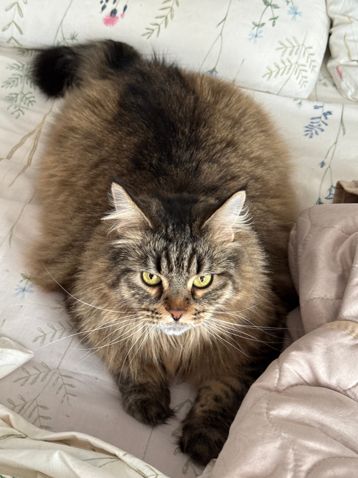 A medium shot captures a brown tabby cat lying on a bed. The cat has long fur, green eyes, and long whiskers. The cat is partly covered by a beige quilt. The bed has a patterned white sheet. There are…read more