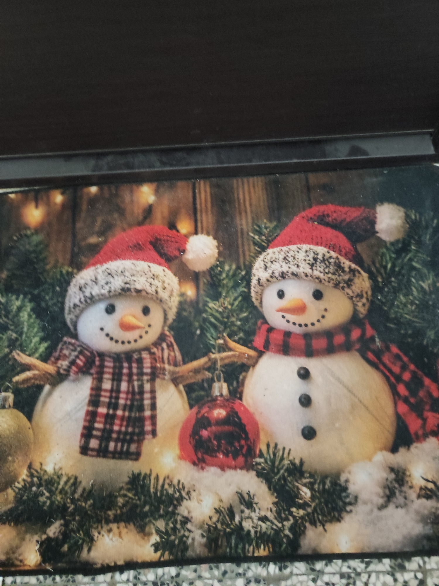 The image captures a festive, winter-themed scene featuring two cheerful snowmen, likely a photograph of a decorative item such as a print or placemat. Both snowmen are depicted with classic Christmas…read more