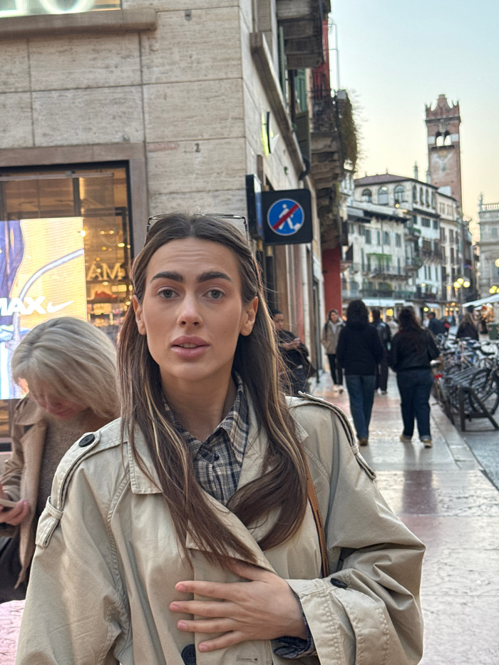 The scene depicts a street in Verona, Italy, with the Lamberti Tower prominently visible in the background. In the foreground, a young adult female with long, dark brown hair and clear-rimmed glasses…read more