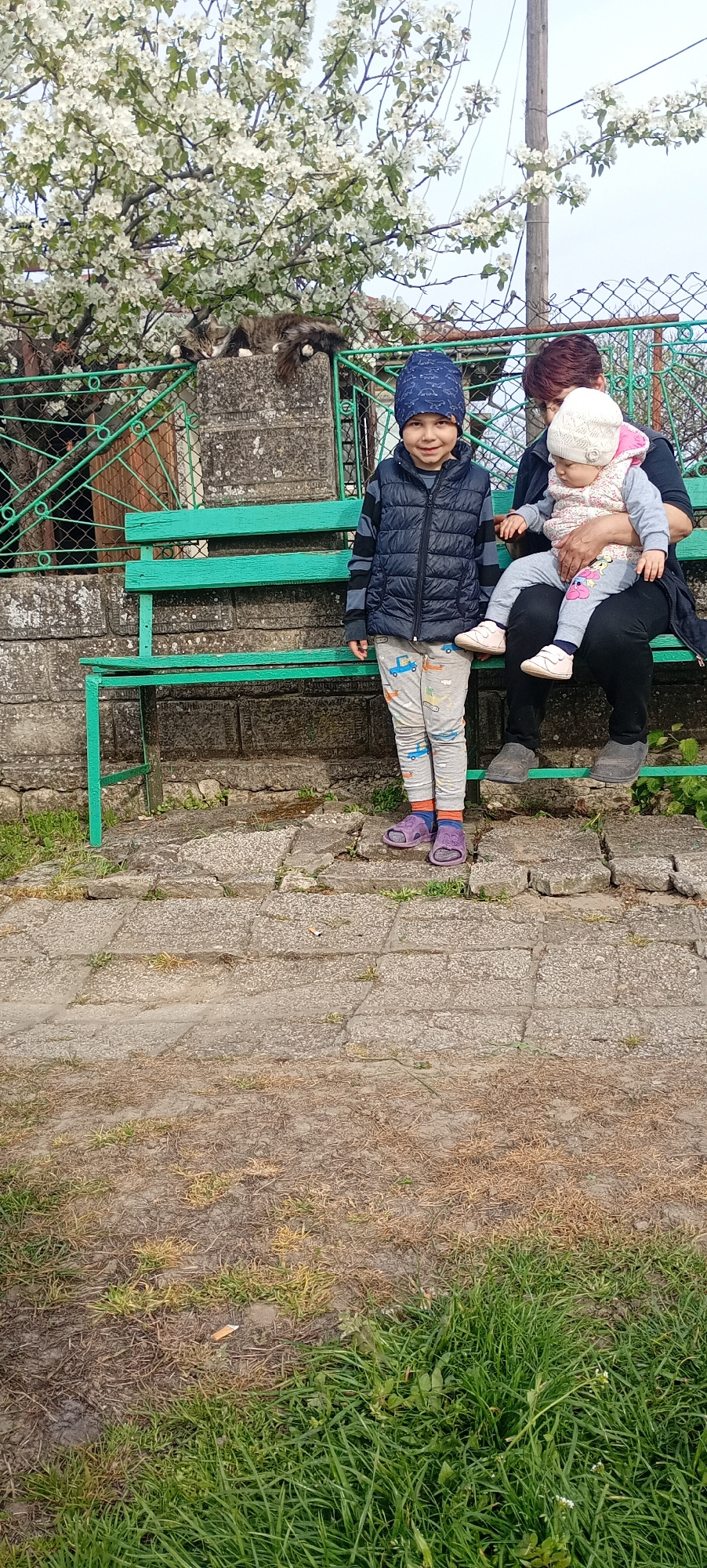 A full outdoor shot shows a small group in what appears to be a residential area in Alfatar, Bulgaria. The scene centers around a green metal bench next to a short, aged, stone wall. A mature floweriβ¦read more