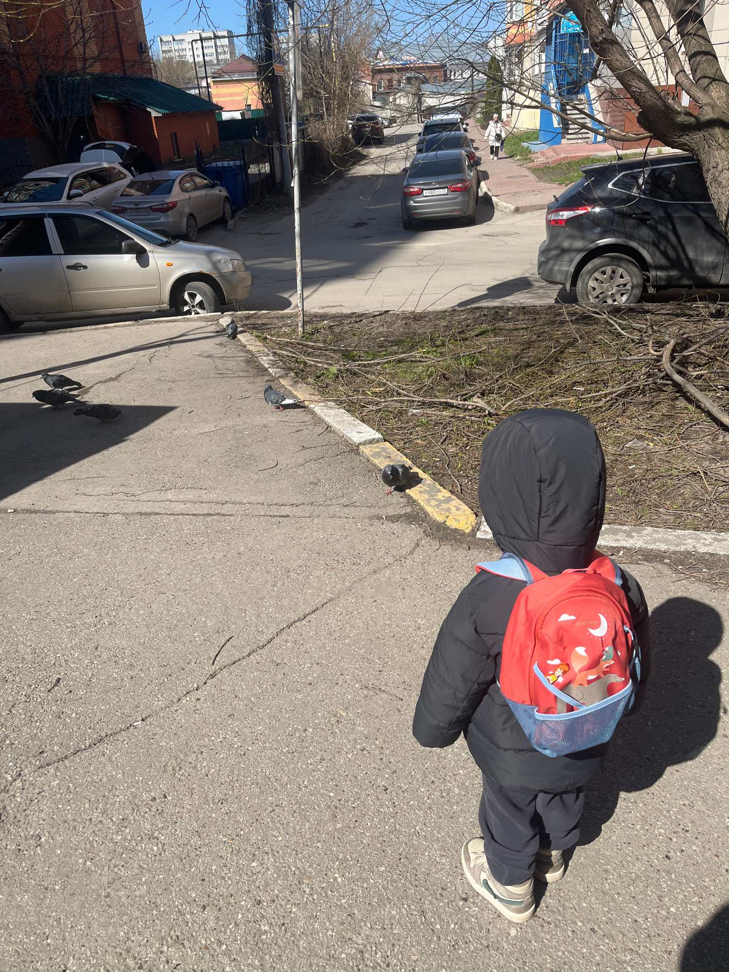A child wearing a black jacket, gray pants, and white sneakers is standing on a concrete sidewalk in what appears to be Ulyanovsk, Russia. The child is wearing a red backpack with blue mesh pockets. Sā¦read more