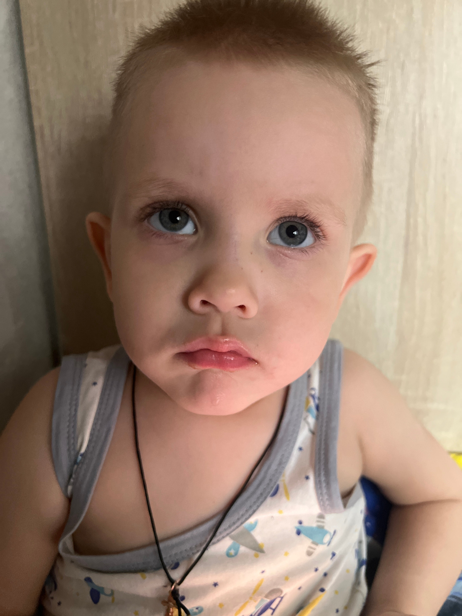 A close-up shot depicts a young child with light hair and blue eyes lying on a surface. The child is wearing a white and grey trimmed tank top with an airplane pattern, and a thin black cord is visibl…read more
